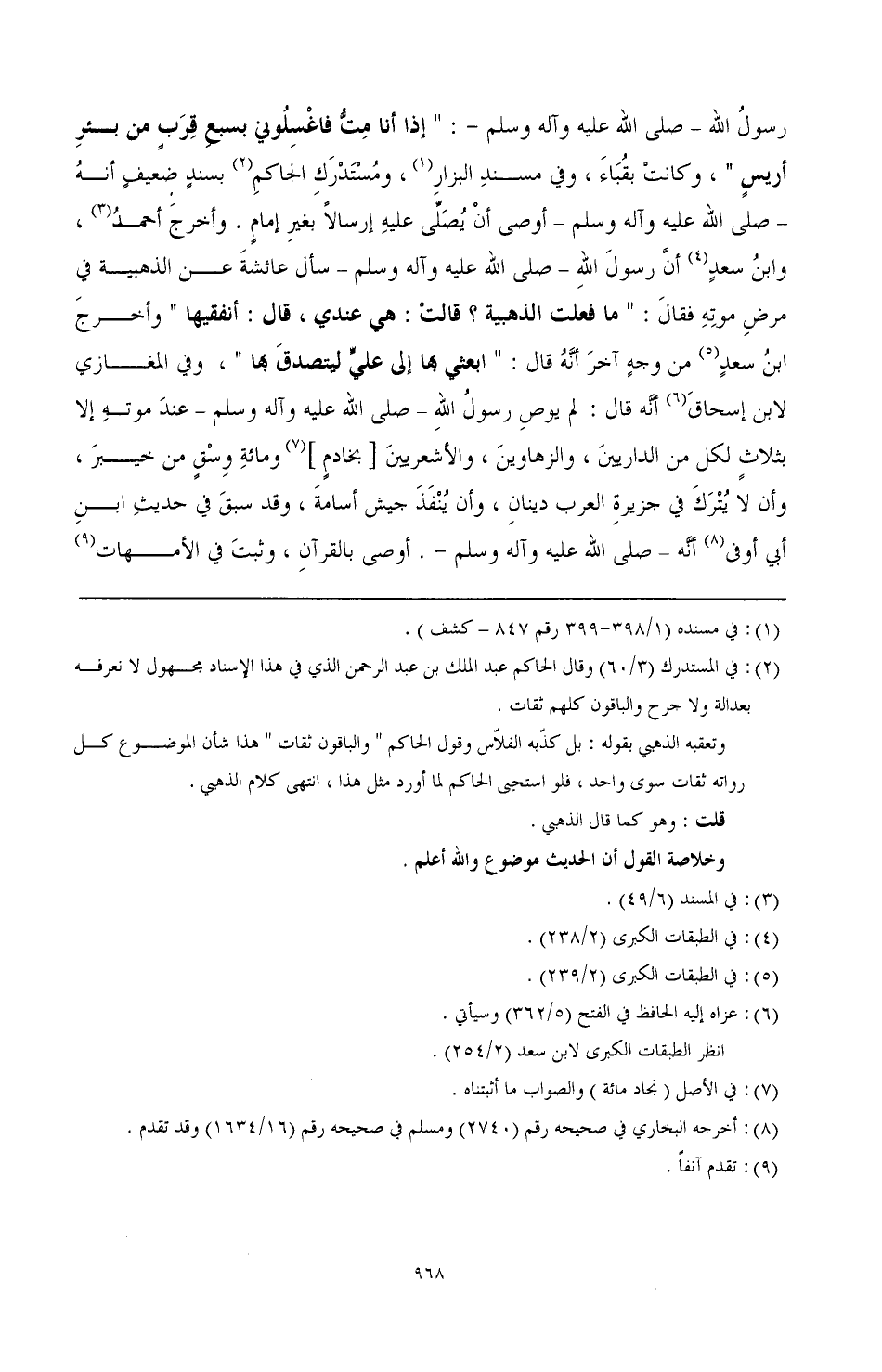رسول الله- صَلَّى اللهُ عَلَيْهِ وَآلِهِ وَسَلَّمَ -: " إذا أنا مت فاغسلوني بسبع قرب من بئر أريس "، وكانت بقباء، وفي مسند البزار (¬1)، ومستدرك الحاكم (¬2) بسند ضعيف أنه - صَلَّى اللهُ عَلَيْهِ وَآلِهِ وَسَلَّمَ - أوصى أن يصلى عليه إرسالا بغير إمام. وأخرج أحمد (¬3)، وابن سعد (¬4) أن رسول الله - صَلَّى اللهُ عَلَيْهِ وَآلِهِ وَسَلَّمَ - سأل عائشة عن الذهبية في مرض موته فقال: " ما فعلت الذهبية؟ قالت: هي عندي، قال: أنفقيها " وأخرج ابن سعد (¬5) من وجه آخر أنه قال: " ابعثي بها إلي علي ليتصدق بها "، وفي المغازي لابن إسحاق (¬6) انه قال: لم يوص رسول الله - صَلَّى اللهُ عَلَيْهِ وَآلِهِ وَسَلَّمَ - عند موته إلا بثلاث لكل من الداريين، والزهاوين، والأشعريين [بخادم] (¬7) ومائه وسق من خيبر، وأن لا يترك في جزيرة العرب دينان، وأن ينفذ جيش أسامة، وقد سبق في حديث ابن أبي أوفى (¬8) انه - صَلَّى اللهُ عَلَيْهِ وَآلِهِ وَسَلَّمَ -. أوصى بالقرآن، وثبت في الأمهات (¬9)