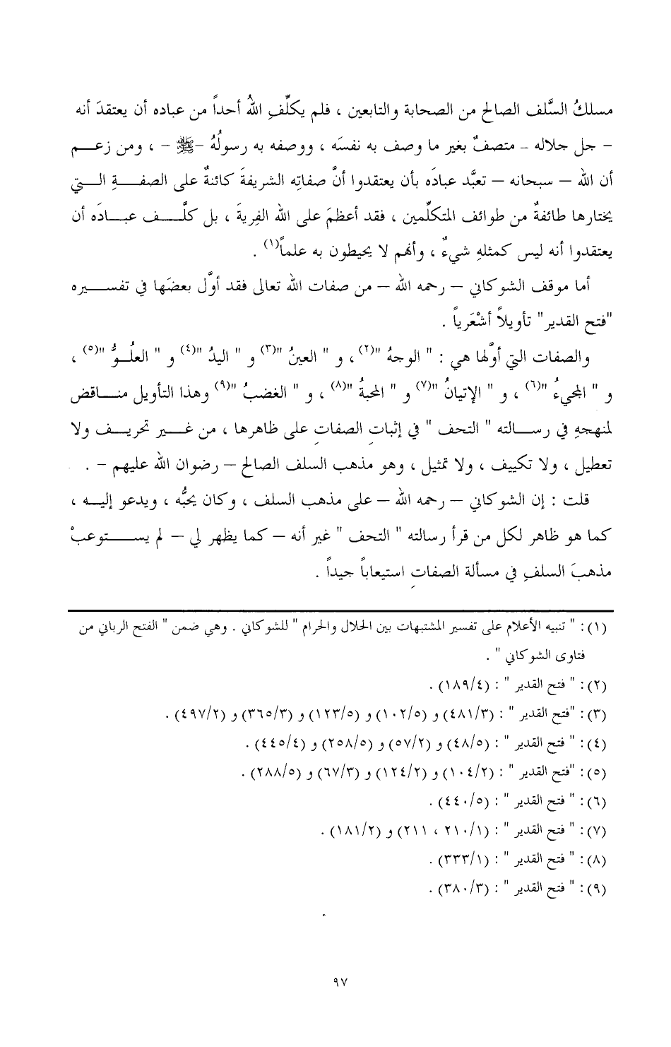 قلت: إن الشوكاني- رحمه الله- على مذهب السلف، وكان يحبه، ويدعو إليه، كما هو ظاهر لكل من قرأ رسالته " التحف " غير أنه- كما يظهر لي- لم يستوعب مذهب السلف في مسألة الصفات استيعابا جيدا.