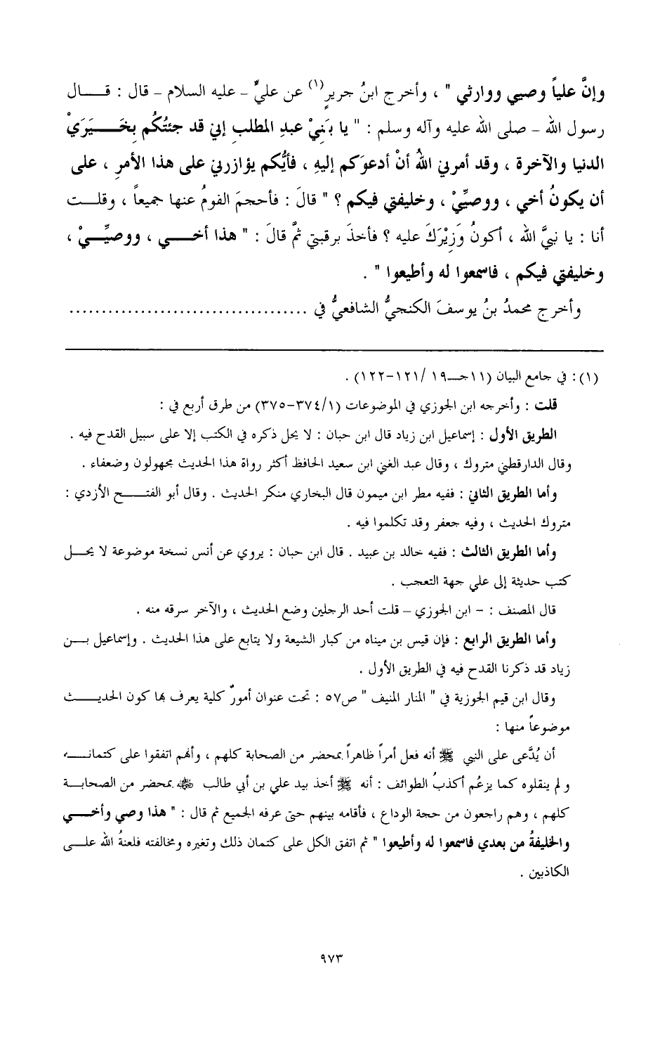 وقال ابن فيم الجوزية في " المنار المنيف " ص 57: تحت عنوان أمور كلية يعرف بما كون الحديث موضوعا منها: أن يدعي على النبي صَلَّى اللهُ عَلَيْهِ وَسَلَّمَ أنه فعل أميرا ظاهرا. بمحضر من الصحابة كلهم، وأنهم اتفقوا على كتمانه ولم ينقلوه كما يزعم أكذب الطوائف: أنه صَلَّى اللهُ عَلَيْهِ وَسَلَّمَ أخذ بيد على بن أبي طالب رضي الله عنه. بمحضر من الصحابة كلهم، وهم راجعون من حجة الوداع، فأقامه بينهم حتى عرفه الجميع ثم قال: " هذا وعي وأخي والحليفة من بعدي فاسمعوا له وأطيعوا " ثم اتفق الكل على كتمان ذلك وتغيره ومخالفته فلعنة الله على الكاذبين.