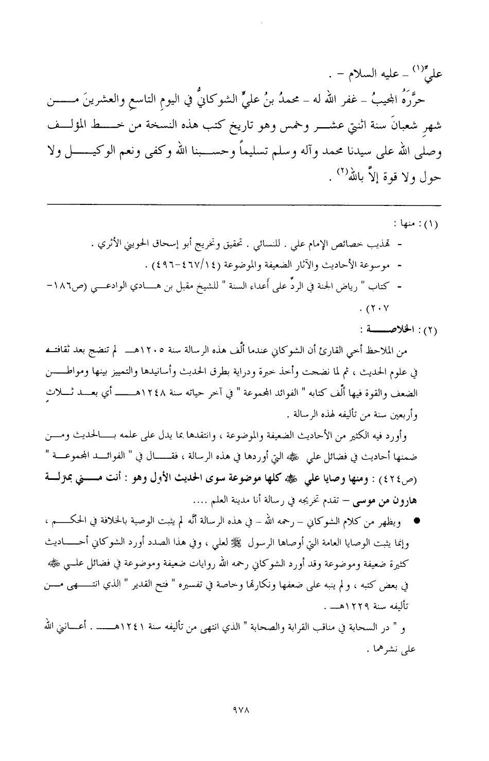 وأورد فيه الكثير من الأحاديث الضعيفة والموضوعة، وانتقدها. مما يدل على علمه بالحديث ومن ضمنها أحاديث في فضائل على! به التي أوردها في هذه الرسالة، فقال في " الفوائد المجموعة " (ص 424): ومنها وصايا علي! ه كل! موضوعة سوى الحديث الأول وهو: أنت مني بمنزلة هارون من موسى - تقدم تخريجه في رسالة أنا مدينة العلم. . . . . . .