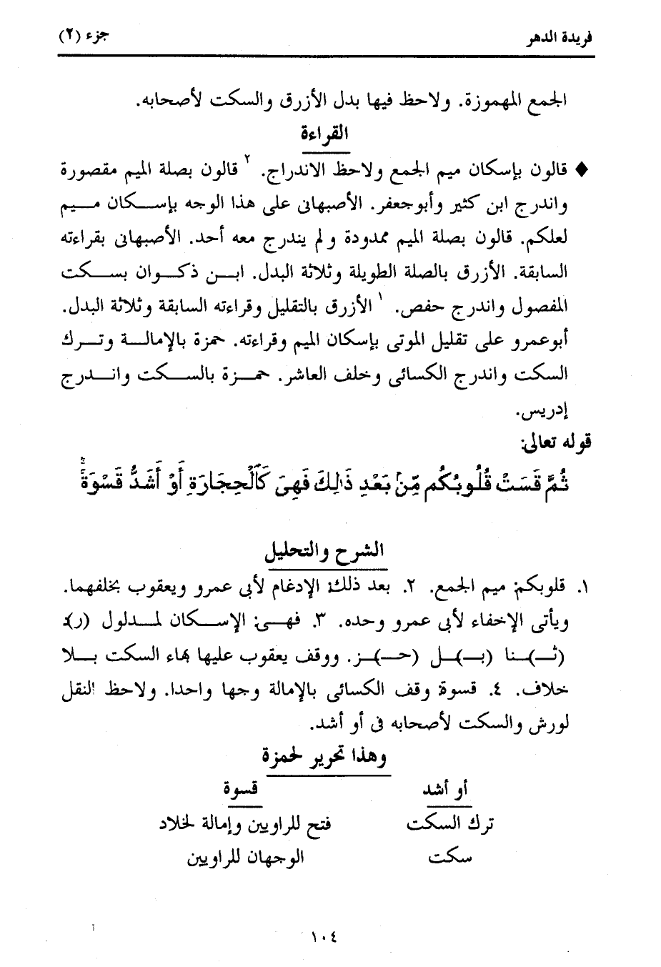 ويأتى الإخفاء لأبى عمرو وحده. 3. فهى: الإسكان لمدلول (ر) د (ث) نا (ب) ل (ح) ز. ووقف يعقوب عليها بهاء السكت بلا خلاف. 4. قسوة: وقف الكسائى بالإمالة وجها واحدا. ولاحظ النقل لورش والسكت لأصحابه فى أو أشد.