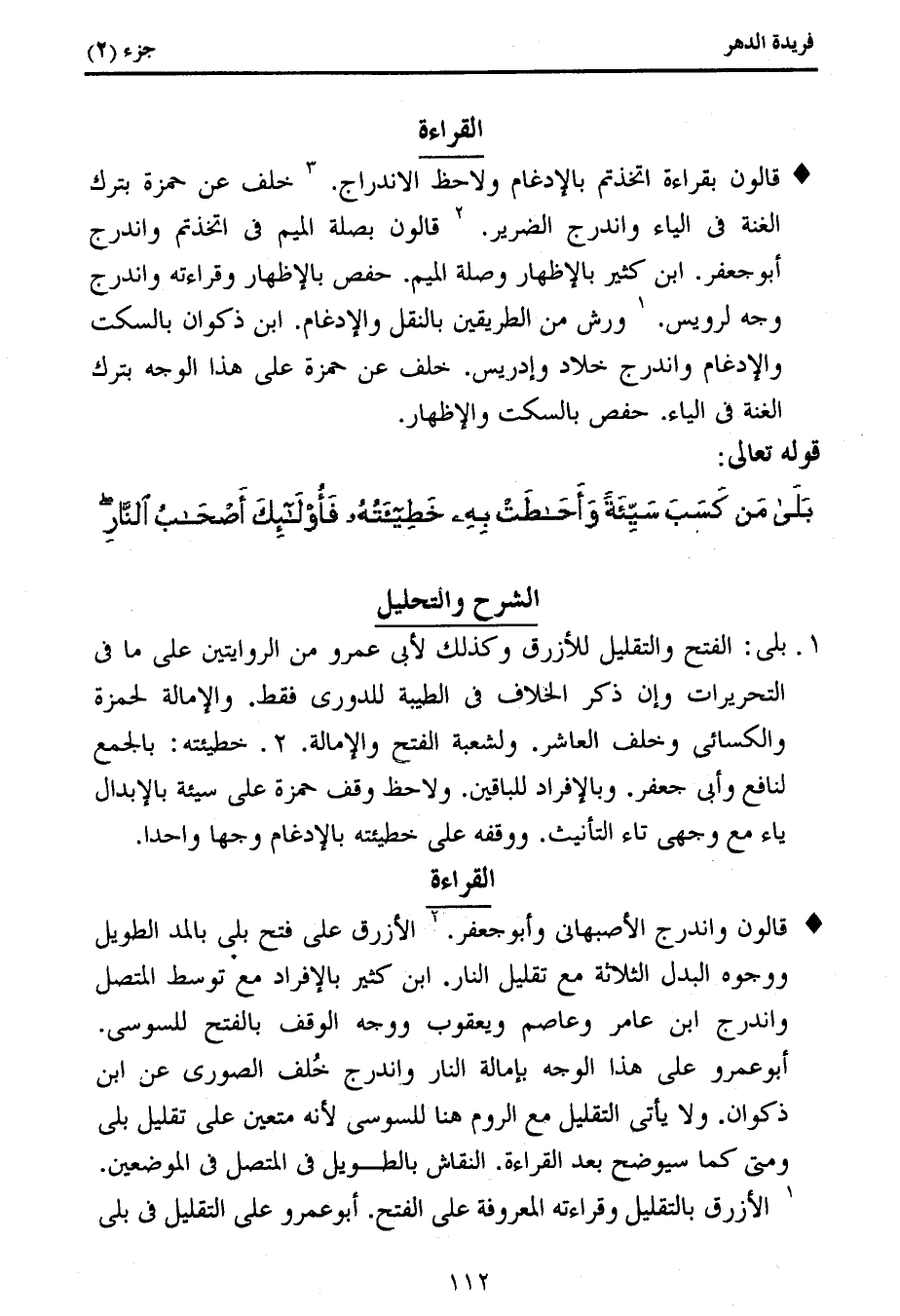 1. بلى: الفتح والتقليل للأزرق وكذلك لأبى عمرو من الروايتين على ما فى التحريرات وإن ذكر الخلاف فى الطيبة للدورى فقط. والإمالة لحمزة والكسائى وخلف العاشر. ولشعبة الفتح والإمالة. 2. خطيئته: بالجمع لنافع وأبى جعفر. وبالإفراد للباقين. ولاحظ وقف حمزة على سيئة بالإبدال ياء مع وجهى تاء التأنيث. ووقفه على خطيئته بالإدغام وجها واحدا.