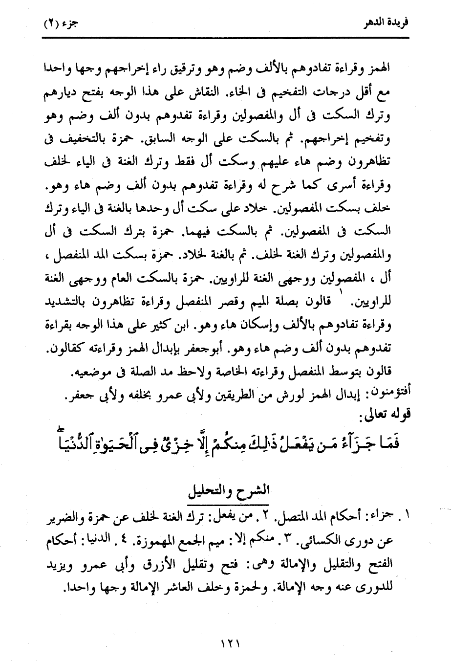 1. جزاء: أحكام المد المتصل. 2. من يفعل: ترك الغنة لخلف عن حمزة والضرير عن دورى الكسائى. 3. منكم إلا: ميم الجمع المهموزة. 4. الدنيا: أحكام الفتح والتقليل والإمالة وهى: فتح وتقليل الأزرق وأبى عمرو ويزيد للدورى عنه وجه الإمالة. ولحمزة وخلف العاشر الإمالة وجها واحدا.