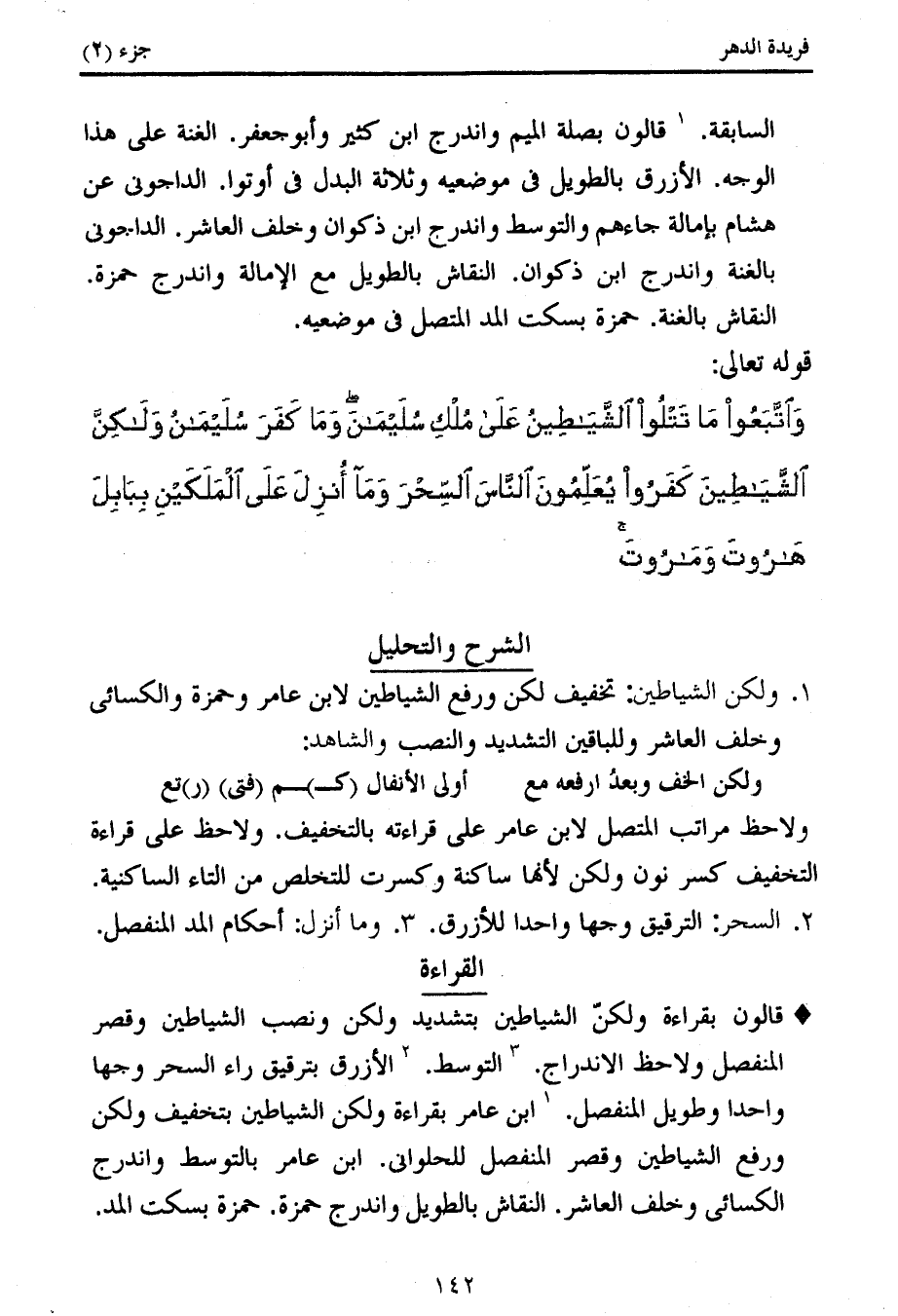قالون بقراءة ولكنّ الشياطين بتشديد ولكن ونصب الشياطين وقصر المنفصل ولاحظ الاندراج. 3 التوسط. 2 الأزرق بترقيق راء السحر وجها واحدا وطويل المنفصل. 1 ابن عامر بقراءة ولكن الشياطين بتخفيف ولكن ورفع الشياطين وقصر المنفصل للحلوانى. ابن عامر بالتوسط واندرج الكسائى وخلف العاشر. النقاش بالطويل واندرج حمزة. حمزة بسكت المد.