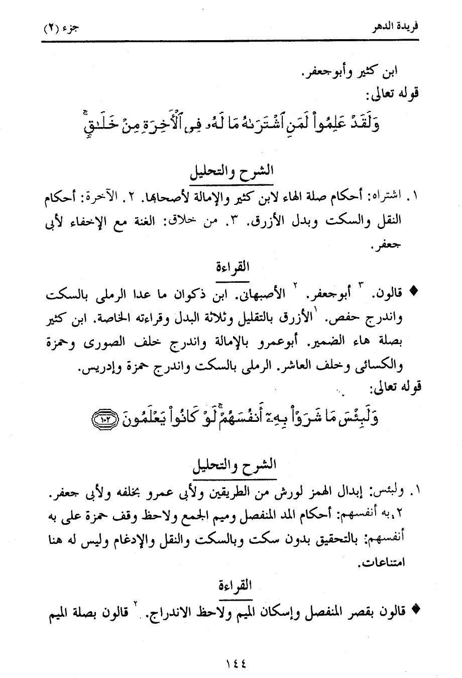 1. اشتراه: أحكام صلة الهاء لابن كثير والإمالة لأصحابها. 2. الآخرة: أحكام النقل والسكت وبدل الأزرق. 3. من خلاق: الغنة مع الإخفاء لأبى جعفر.