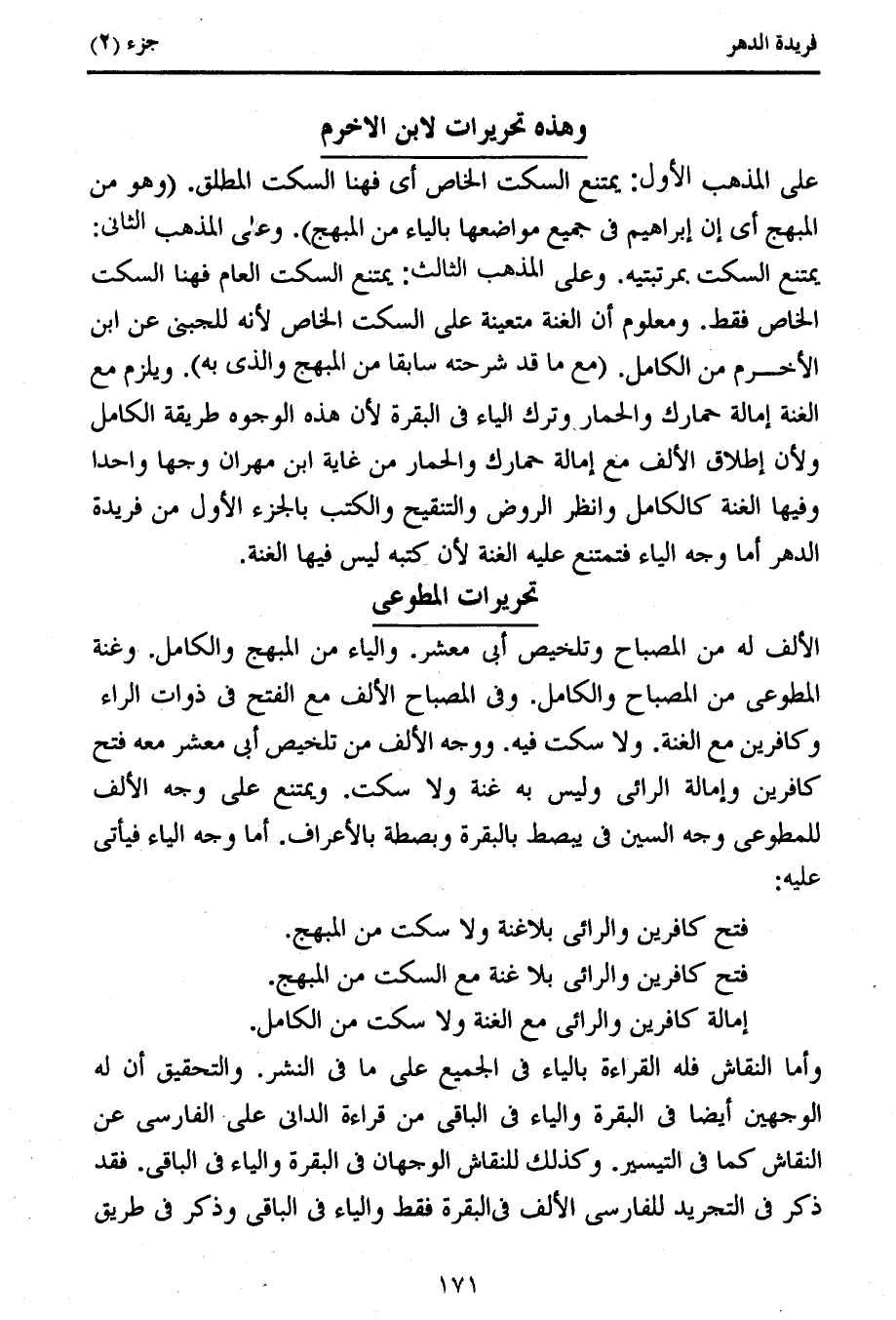 يمتنع السكت بمرتبتيه. وعلى المذهب الثالث: يمتنع السكت العام فهنا السكت الخاص فقط. ومعلوم أن الغنة متعينة على السكت الخاص لأنه للجبنى عن ابن الأخرم من الكامل. (مع ما قد شرحته سابقا من المبهج والذى به). ويلزم مع الغنة إمالة حمارك والحمار وترك الياء فى البقرة لأن هذه الوجوه طريقة الكامل ولأن إطلاق الألف مع إمالة حمارك والحمار من غاية ابن مهران وجها واحدا وفيها الغنة كالكامل وانظر الروض والتنقيح والكتب بالجزء الأول من فريدة الدهر أما وجه الياء فتمتنع عليه الغنة لأن كتبه ليس فيها الغنة.