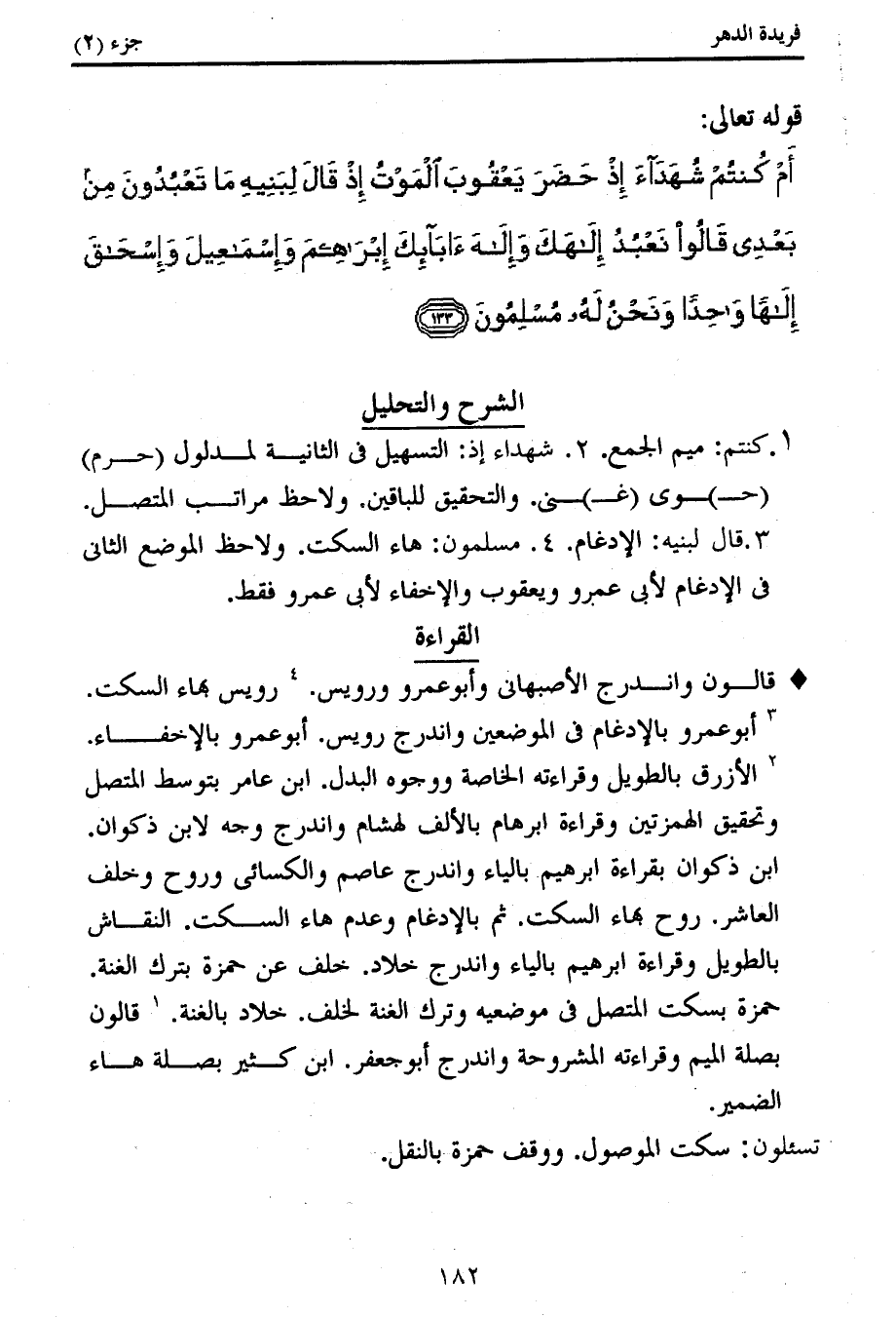 1. كنتم: ميم الجمع. 2. شهداء إذ: التسهيل فى الثانية لمدلول (حرم) (ح) وى (غ) نى. والتحقيق للباقين. ولاحظ مراتب المتصل.
