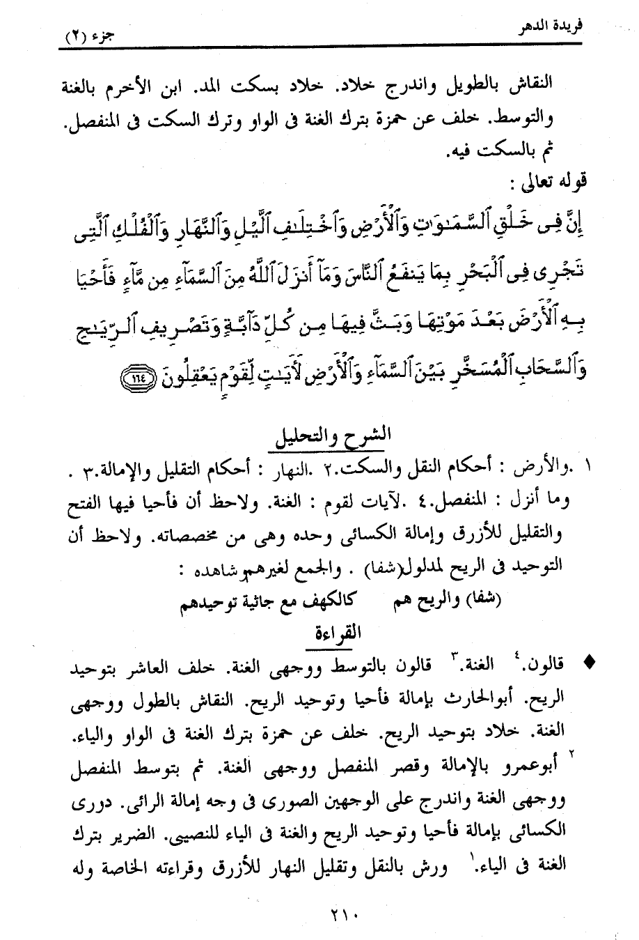 وما أنزل: المنفصل. 4. لآيات لقوم: الغنة. ولاحظ أن فأحيا فيها الفتح والتقليل للأزرق وإمالة الكسائى وحده وهى من مخصصاته. ولاحظ أن التوحيد فى الريح لمدلول (شفا). والجمع لغيرهم وشاهده: