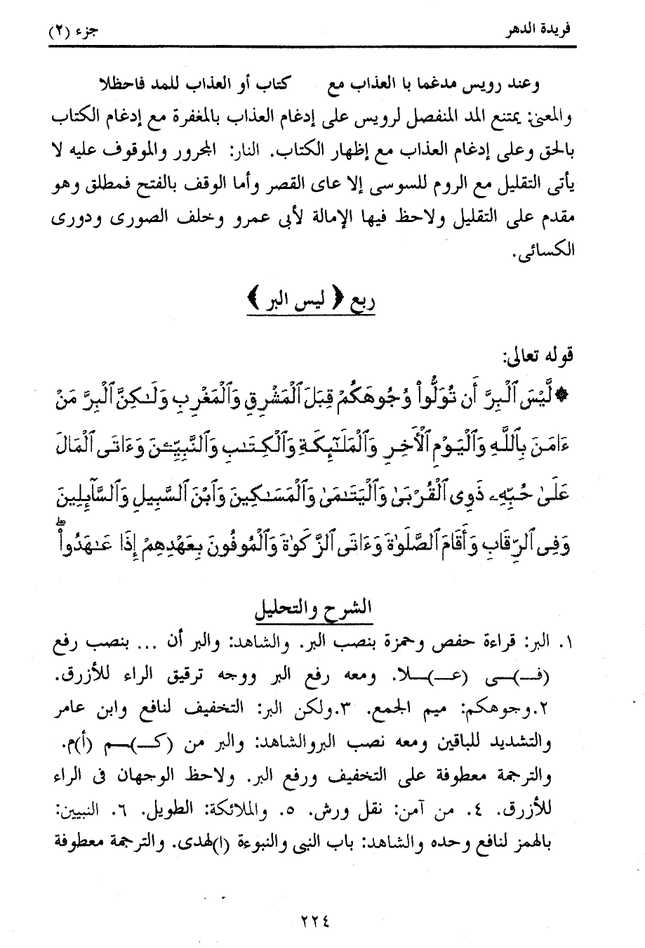 1. البر: قراءة حفص وحمزة بنصب البر. والشاهد: والبر أن ... بنصب رفع (ف) ى (ع) لا. ومعه رفع البر ووجه ترقيق الراء للأزرق.