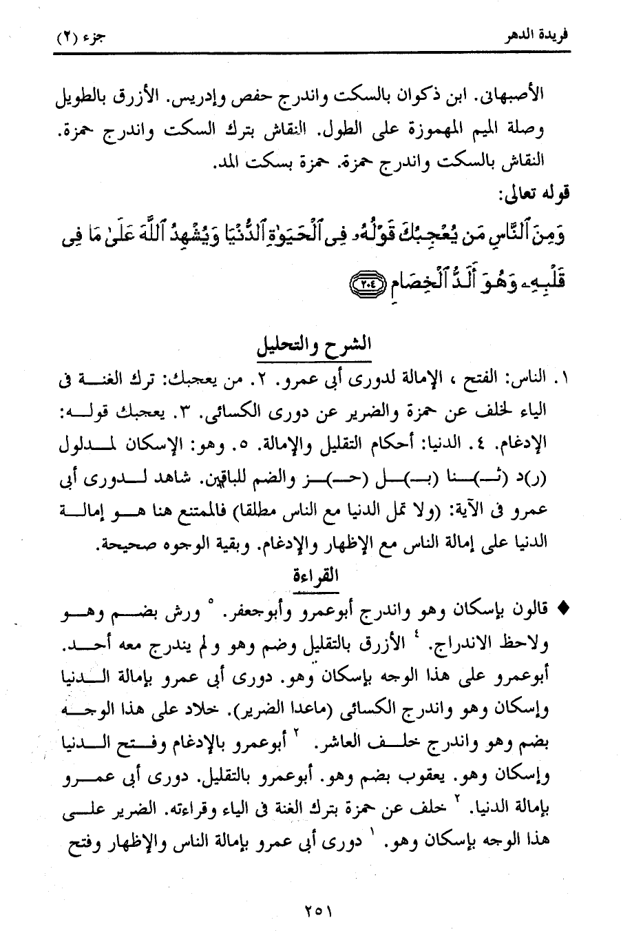 1. الناس: الفتح، الإمالة لدورى أبى عمرو. 2. من يعجبك: ترك الغنة فى الياء لخلف عن حمزة والضرير عن دورى الكسائى. 3. يعجبك قوله: