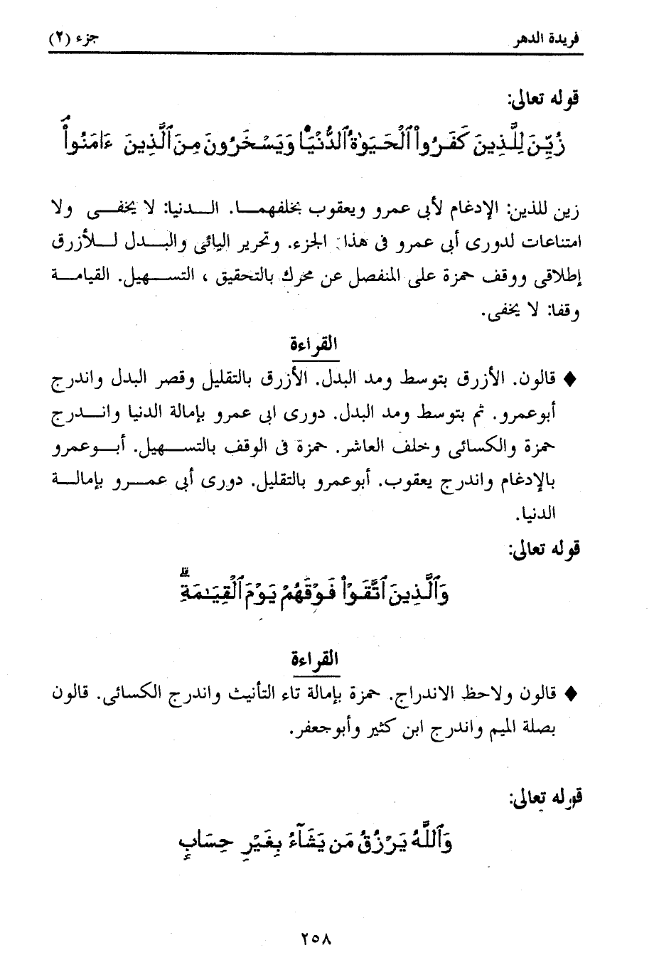 زين للذين: الإدغام لأبى عمرو ويعقوب بخلفهما. الدنيا: لا يخفى ولا امتناعات لدورى أبى عمرو فى هذا الجزء. وتحرير اليائى والبدل للأزرق إطلاقى ووقف حمزة على المنفصل عن محرك بالتحقيق، التسهيل. القيامة وقفا: لا يخفى.