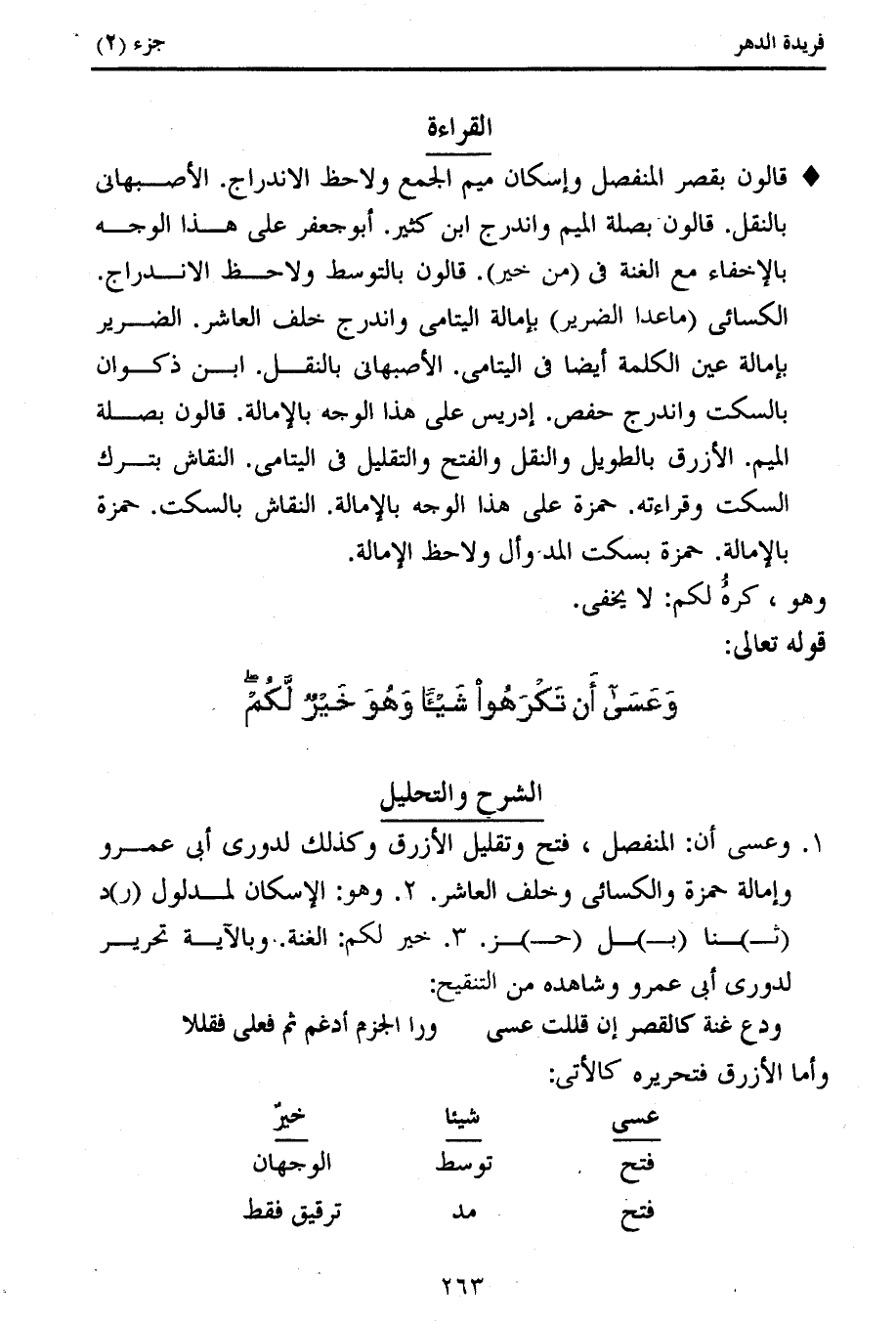 1. وعسى أن: المنفصل، فتح وتقليل الأزرق وكذلك لدورى أبى عمرو وإمالة حمزة والكسائى وخلف العاشر. 2. وهو: الإسكان لمدلول (ر) د (ث) نا (ب) ل (ح) ز. 3. خير لكم: الغنة. وبالآية تحرير لدورى أبى عمرو وشاهده من التنقيح: