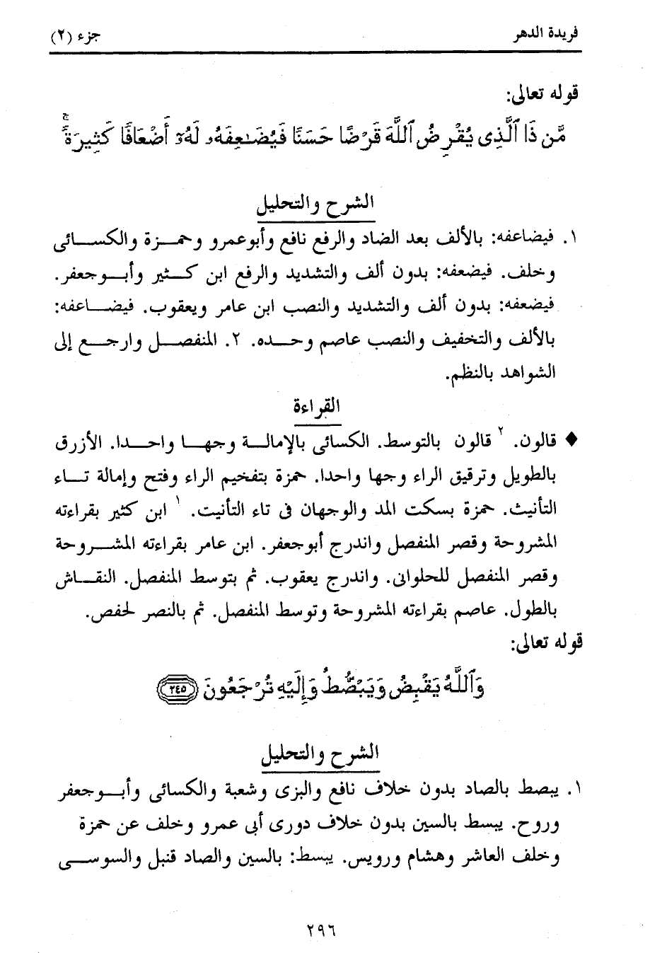 1. فيضاعفه: بالألف بعد الضاد والرفع نافع وأبو عمرو وحمزة والكسائى وخلف. فيضعفه: بدون ألف والتشديد والرفع ابن كثير وأبو جعفر.
