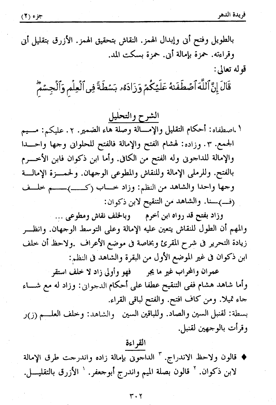 1. اصطفاه: أحكام التقليل والإمالة وصلة هاء الضمير. 2. عليكم: ميم الجمع. 3. وزاده: لهشام الفتح والإمالة فالفتح للحلوانى وجها واحدا والإمالة للداجونى وله الفتح من الكافى. وأما ابن ذكوان فابن الأخرم بالفتح. وللرملى الإمالة وللنقاش والمطوعى الوجهان. ولحمزة الإمالة وجها واحدا والشاهد من النظم: وزاد خاب (ك) م خلف (ف) نا. والشاهد من التنقيح لابن ذكوان: