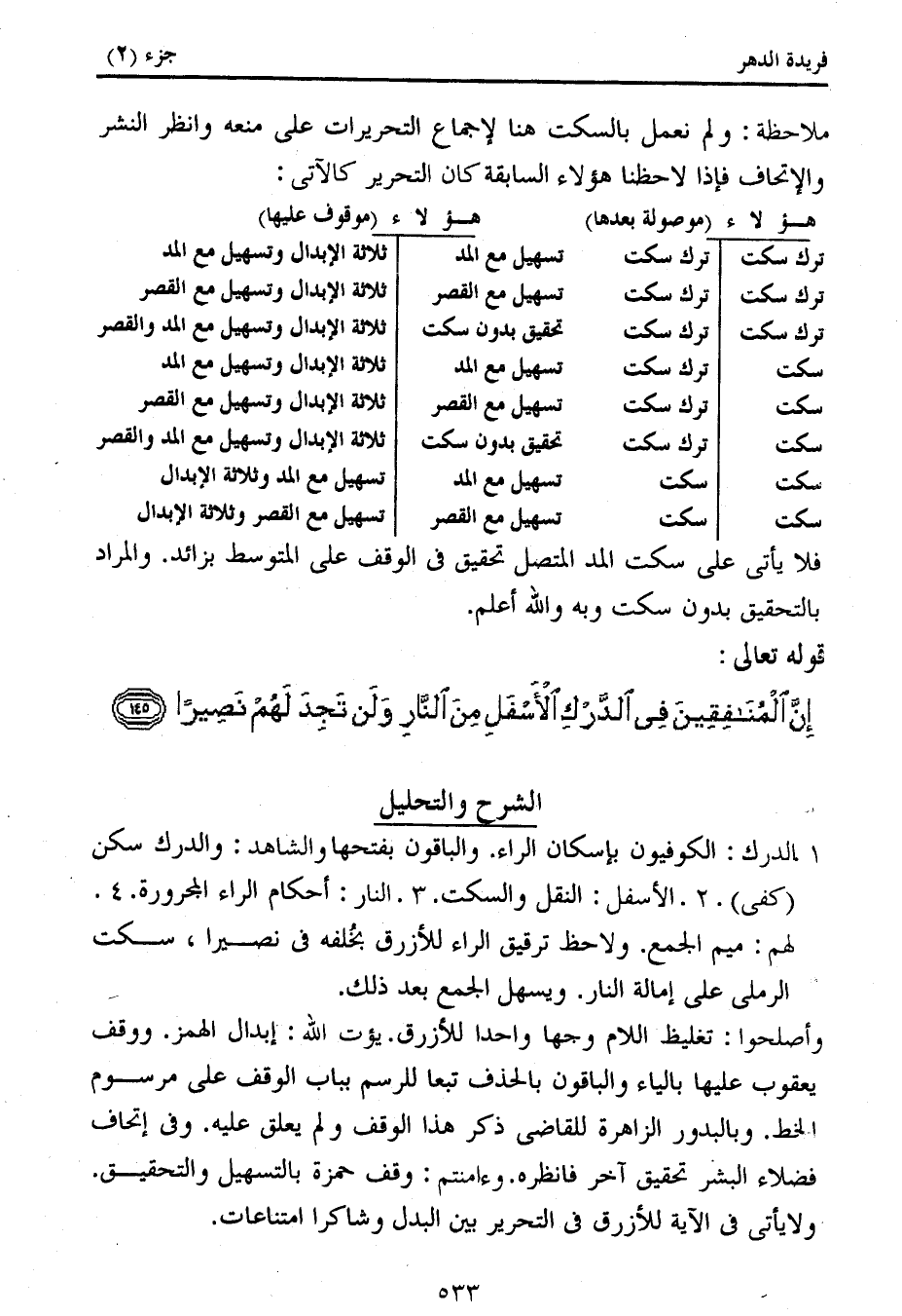 1. الدرك: الكوفيون بإسكان الراء. والباقون بفتحها والشاهد: والدرك سكن (كفى). 2. الأسفل: النقل والسكت. 3. النار: أحكام الراء المجرورة. 4.