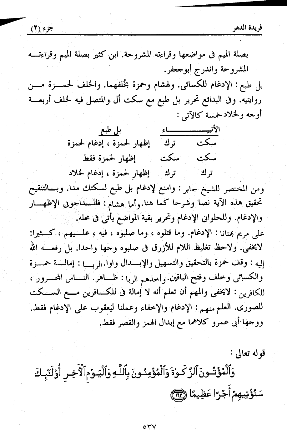 لا يخفى. ولاحظ تغليظ اللام للأزرق فى صلبوه وجها واحدا. بل رفعه الله إليه: وقف حمزة بالتحقيق والتسهيل والإبدال واوا. الربا: إمالة حمزة والكسائى وخلف وفتح الباقين. وأخذهم الربا: ظاهر. الناس المجرور، للكافرين: لا يخفى والمهم أن تعلم أنه لا إمالة فى للكافرين مع السكت للصورى. العلم منهم: الإدغام والإخفاء وعملنا ليعقوب على الإدغام فقط.