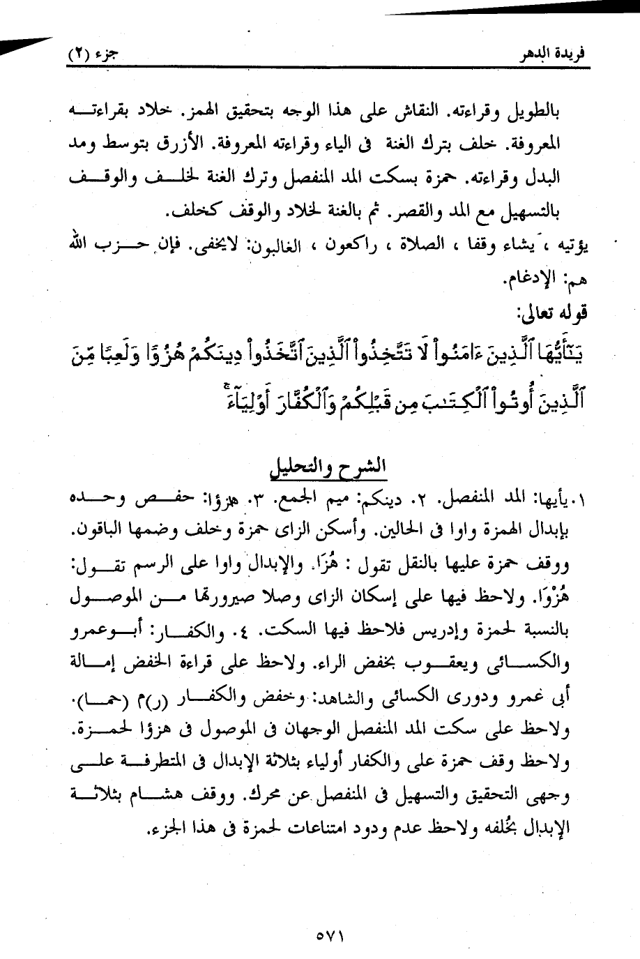 1. يأيها: المد المنفصل. 2. دينكم: ميم الجمع. 3. هزؤا: حفص وحده بإبدال الهمزة واوا فى الحالين. وأسكن الزاى حمزة وخلف وضمها الباقون.