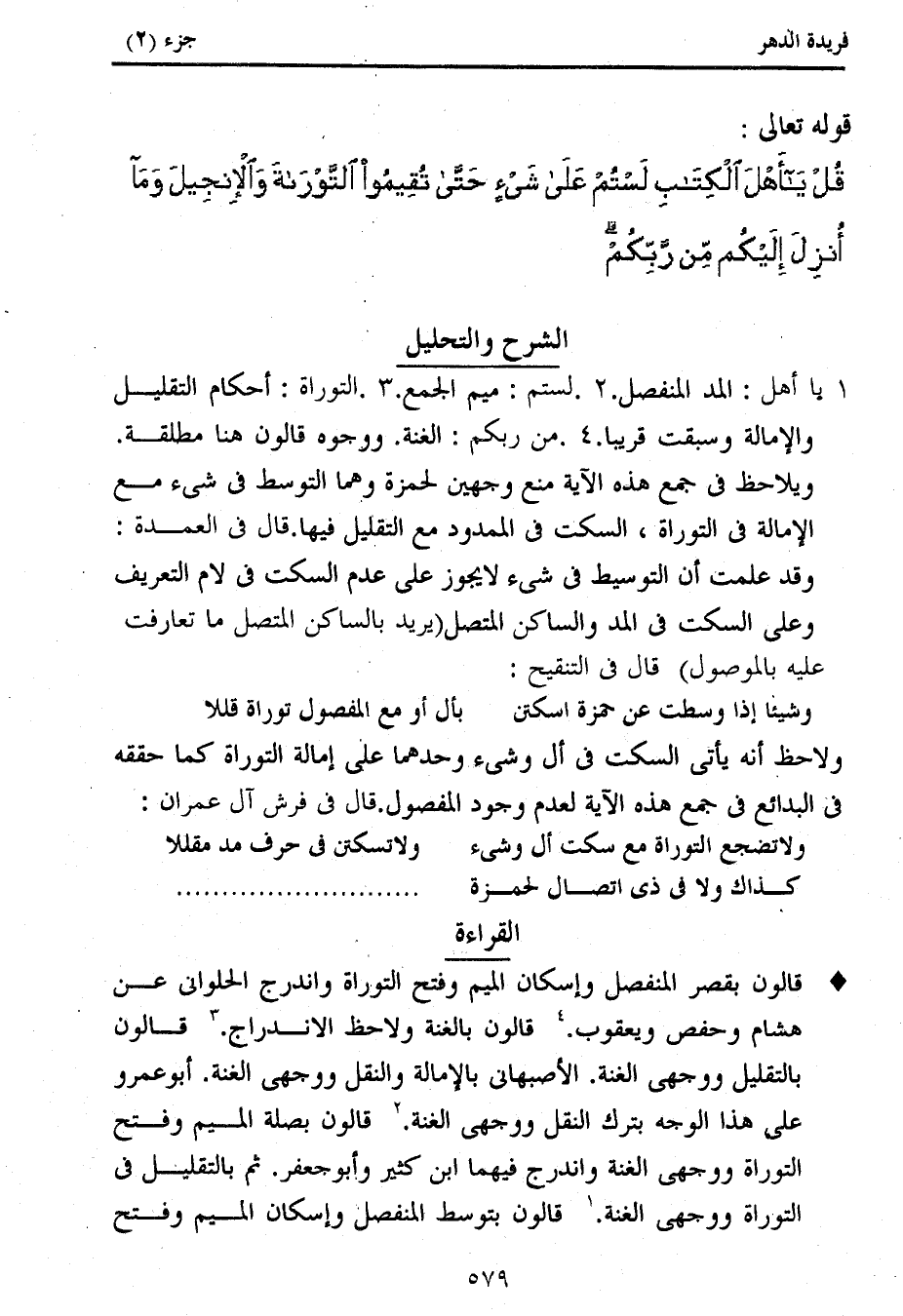 1. يا أهل: المد المنفصل. 2. لستم: ميم الجمع. 3. التوراة: أحكام التقليل والإمالة وسبقت قريبا. 4. من ربكم: الغنة. ووجوه قالون هنا مطلقة.