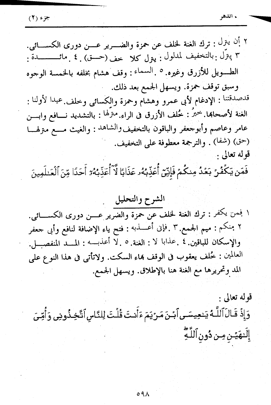 2. منكم: ميم الجمع. 3. فإنى أعذبه: فتح ياء الإضافة لنافع وأبى جعفر والإسكان للباقين. 4. عذابا لا: الغنة. 5. لا أعذبه: المد المنفصل.
