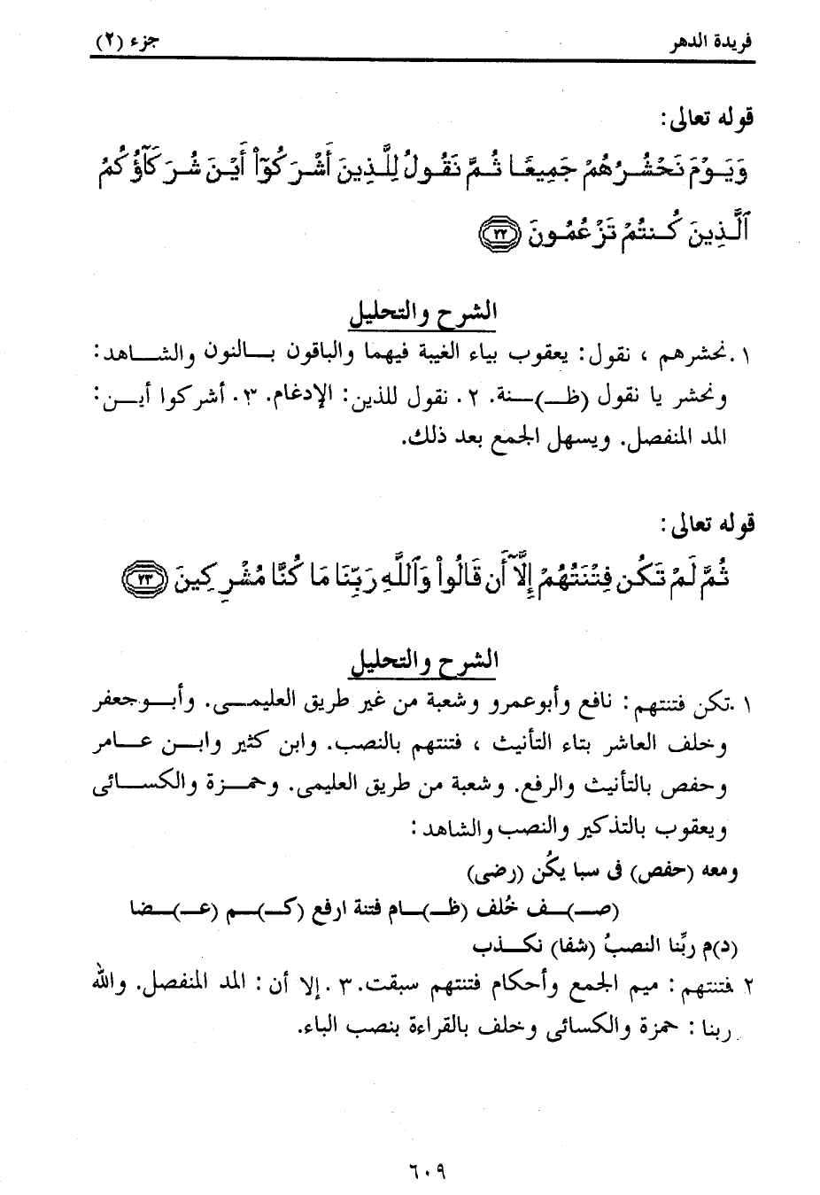 1. تكن فتنتهم: نافع وأبو عمرو وشعبة من غير طريق العليمى. وأبو جعفر وخلف العاشر بتاء التأنيث، فتنتهم بالنصب. وابن كثير وابن عامر وحفص بالتأنيث والرفع. وشعبة من طريق العليمى. وحمزة والكسائى ويعقوب بالتذكير والنصب والشاهد: