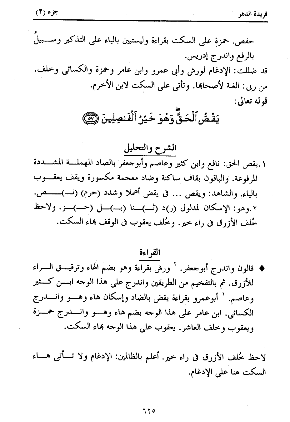 1. يقص الحق: نافع وابن كثير وعاصم وأبو جعفر بالصاد المهملة المشددة المرفوعة. والباقون بقاف ساكنة وضاد معجمة مكسورة ويقف يعقوب بالياء. والشاهد: ويقص ... فى يقض أهملا وشدد (حرم) (ن) ص.