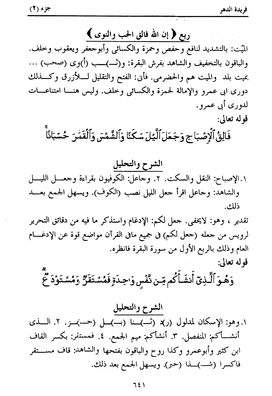 1. الإصباح: النقل والسكت. 2. وجاعل: الكوفيون بقراءة وجعل الليل والشاهد: وجاعل اقرأ جعل الليل نصب (الكوف). ويسهل الجمع بعد ذلك.
