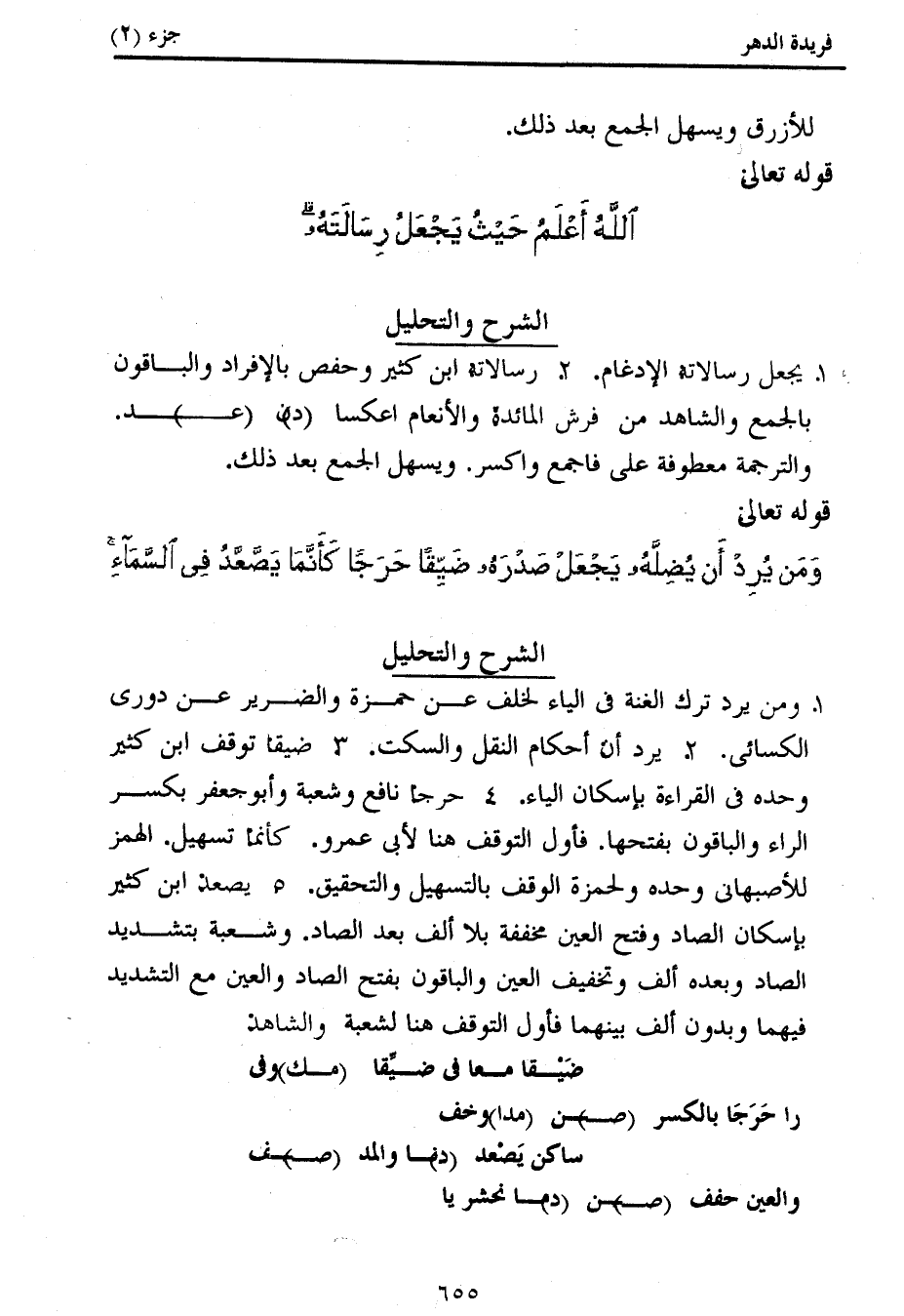 1. ومن يرد: ترك الغنة فى الياء لخلف عن حمزة والضرير عن دورى الكسائى. 2. يرد أن: أحكام النقل والسكت. 3. ضيقا: توقف ابن كثير وحده فى القراءة بإسكان الياء. 4. حرجا: نافع وشعبة وأبو جعفر بكسر الراء والباقون بفتحها. فأول التوقف هنا لأبى عمرو. كأنما: تسهيل. الهمز للأصبهانى وحده ولحمزة الوقف بالتسهيل والتحقيق.