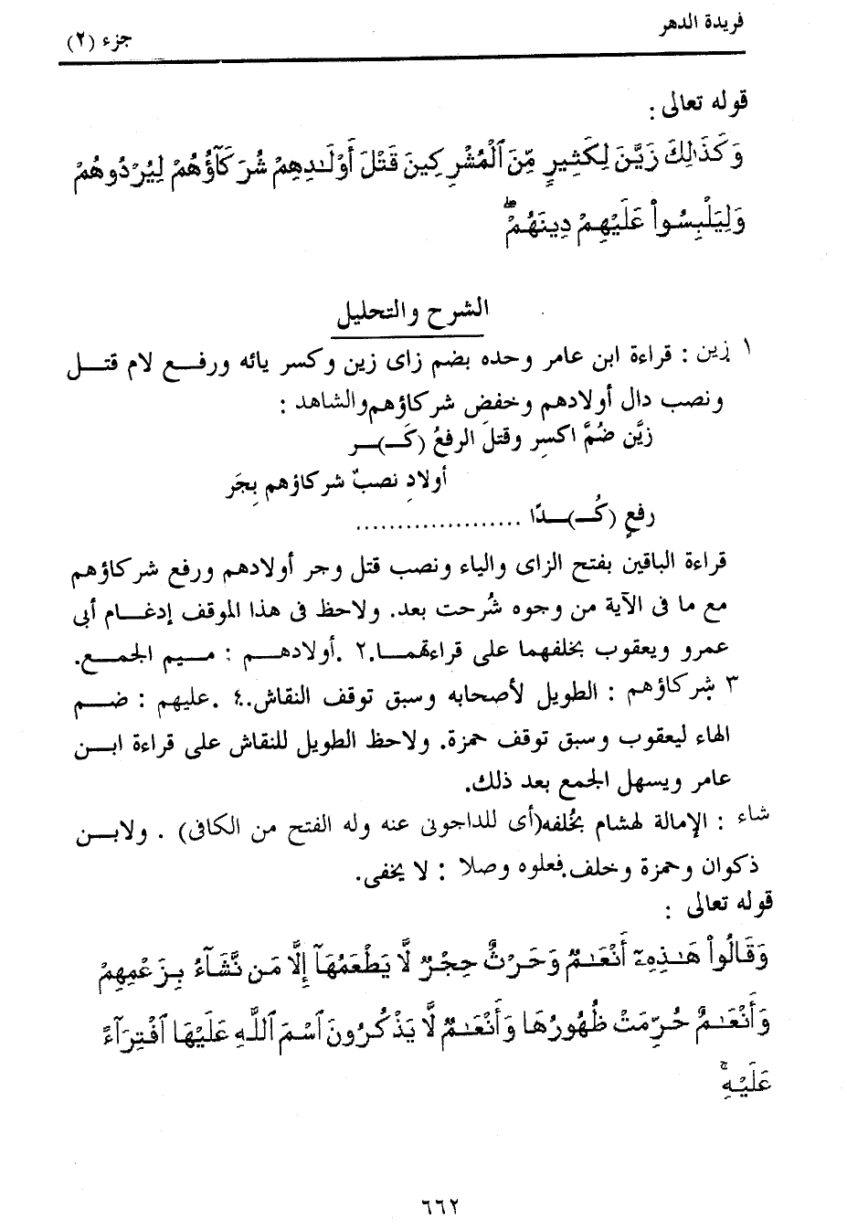 قراءة الباقين بفتح الزاى والياء ونصب قتل وجر أولادهم ورفع شركاؤهم مع ما فى الآية من وجوه شرحت بعد. ولاحظ فى هذا الموقف إدغام أبى عمرو ويعقوب بخلفهما على قراءتهما. 2. أولادهم: ميم الجمع.
