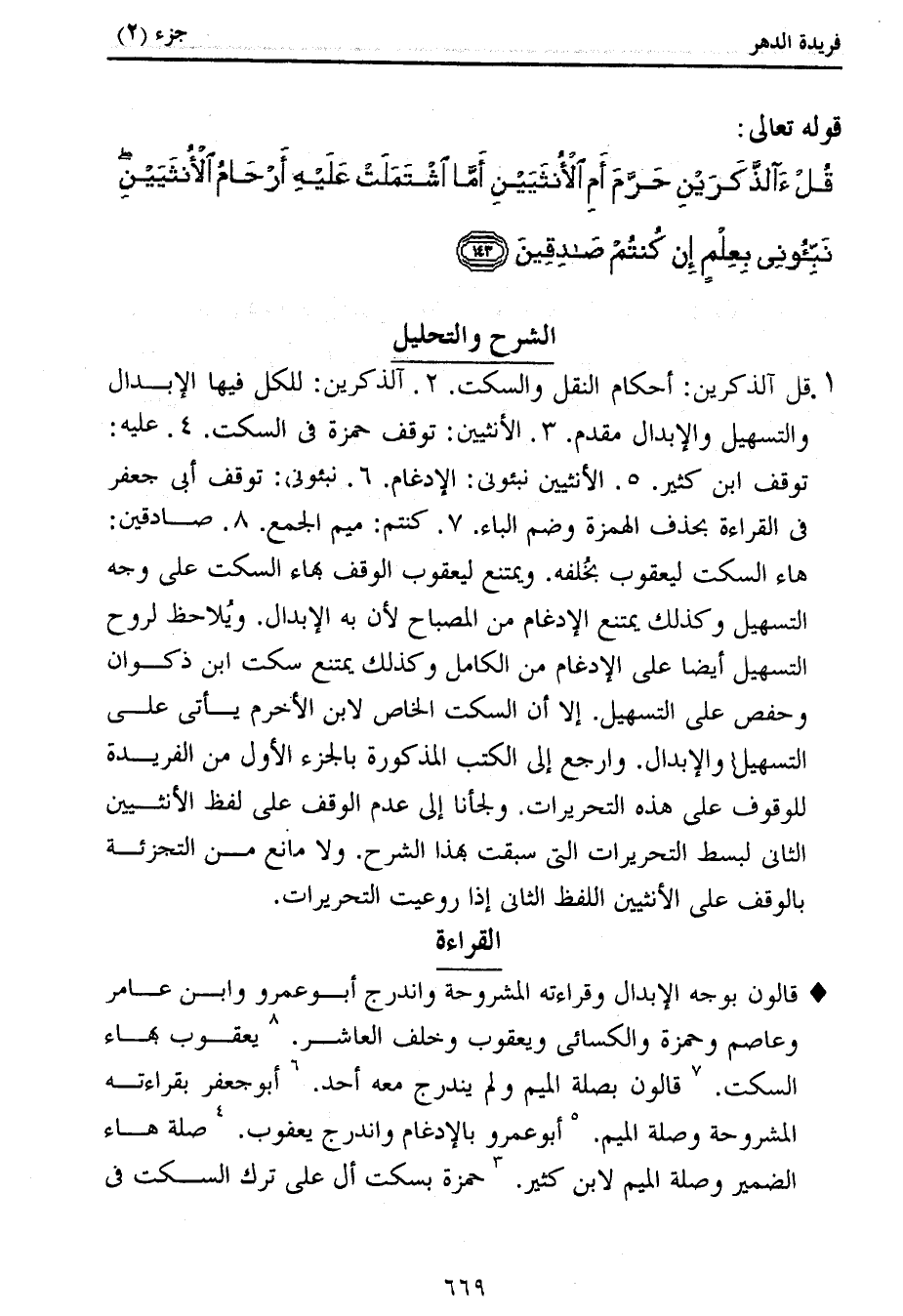 هاء السكت ليعقوب بخلفه. ويمتنع ليعقوب الوقف بهاء السكت على وجه التسهيل وكذلك يمتنع الإدغام من المصباح لأن به الإبدال. ويلاحظ لروح التسهيل أيضا على الإدغام من الكامل وكذلك يمتنع سكت ابن ذكوان وحفص على التسهيل. إلا أن السكت الخاص لابن الأخرم يأتى على التسهيل والإبدال. وارجع إلى الكتب المذكورة بالجزء الأول من الفريدة للوقوف على هذه التحريرات. ولجأنا إلى عدم الوقف على لفظ الأنثيين الثانى لبسط التحريرات التى سبقت بهذا الشرح. ولا مانع من التجزئة بالوقف على الأنثيين اللفظ الثانى إذا روعيت التحريرات.