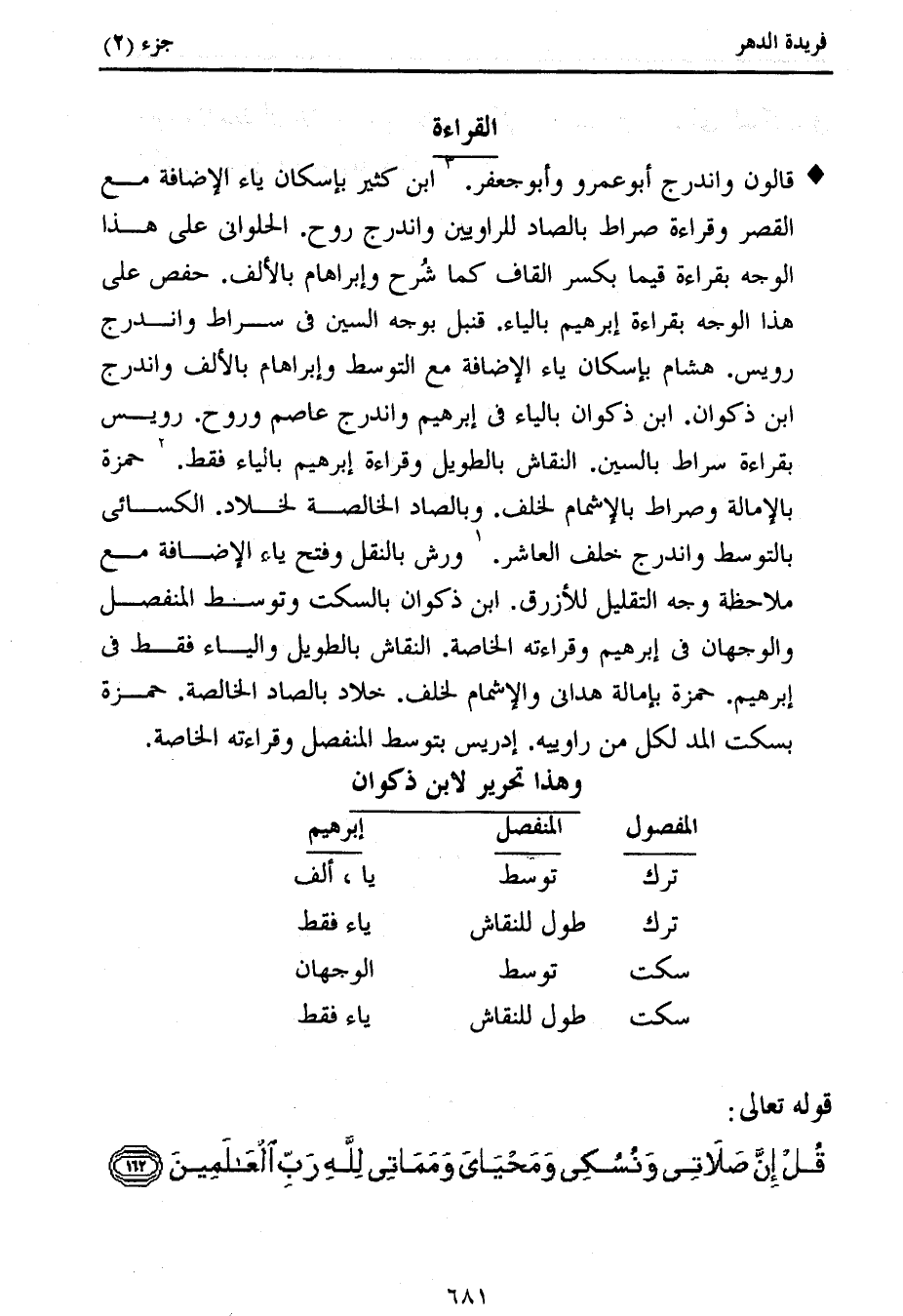 قالون واندرج أبو عمرو وأبو جعفر. 3 ابن كثير بإسكان ياء الإضافة مع القصر وقراءة صراط بالصاد للراويين واندرج روح. الحلوانى على هذا الوجه بقراءة قيما بكسر القاف كما شرح وإبراهام بالألف. حفص على هذا الوجه بقراءة إبراهيم بالياء. قنبل بوجه السين فى سراط واندرج رويس. هشام بإسكان ياء الإضافة مع التوسط وإبراهام بالألف واندرج ابن ذكوان. ابن ذكوان بالياء فى إبراهيم واندرج عاصم وروح. رويس بقراءة سراط بالسين. النقاش بالطويل وقراءة إبراهيم بالياء فقط. 2 حمزة بالإمالة وصراط بالإشمام لخلف. وبالصاد الخالصة لخلاد. الكسائى بالتوسط واندرج خلف العاشر. 1 ورش بالنقل وفتح ياء الإضافة مع ملاحظة وجه التقليل للأزرق. ابن ذكوان بالسكت وتوسط المنفصل والوجهان فى إبراهيم وقراءته الخاصة. النقاش بالطويل والياء فقط فى إبراهيم. حمزة بإمالة هدانى والإشمام لخلف. خلاد بالصاد الخالصة. حمزة بسكت المد لكل من راوييه. إدريس بتوسط المنفصل وقراءته الخاصة.