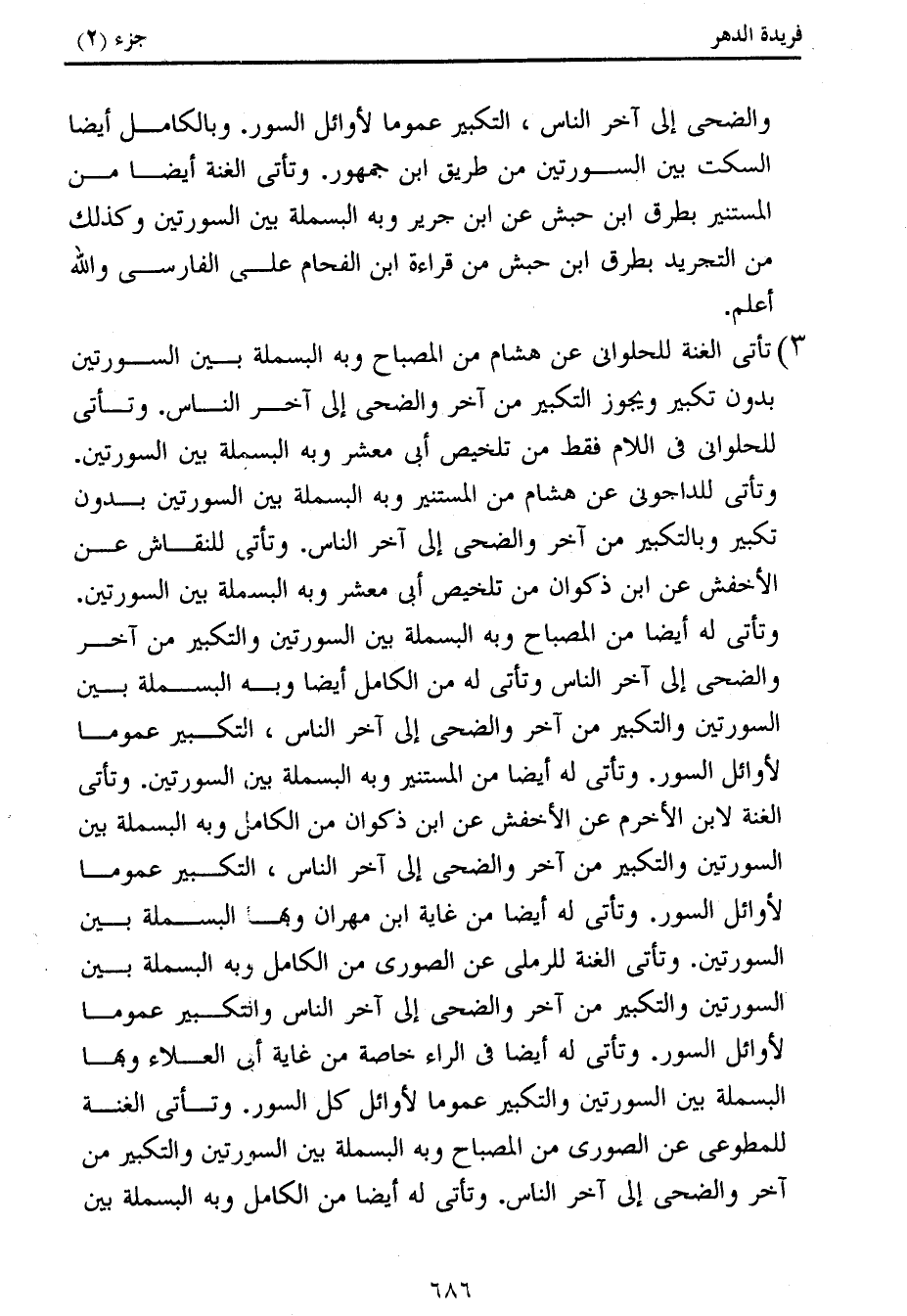 والضحى إلى آخر الناس، التكبير عموما لأوائل السور. وبالكامل أيضا السكت بين السورتين من طريق ابن جمهور. وتأتى الغنة أيضا من المستنير بطرق ابن حبش عن ابن جرير وبه البسملة بين السورتين وكذلك من التجريد بطرق ابن حبش من قراءة ابن الفحام على الفارسى والله أعلم.