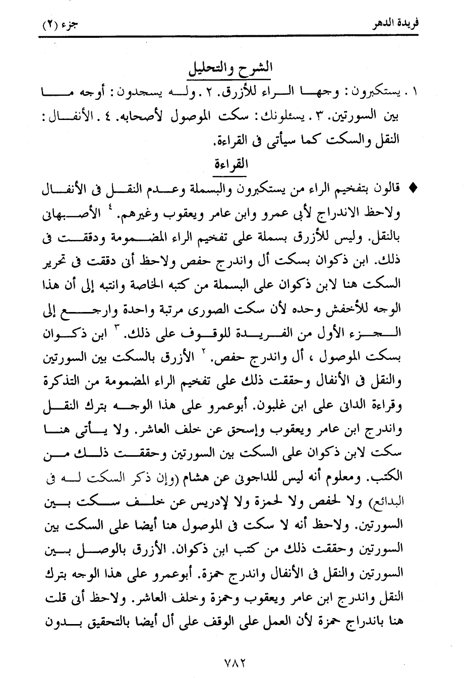 على تفخيم الراء المضمومة ودققت فى ذلك. ابن ذكوان بسكت أل واندرج حفص ولاحظ أنى دققت فى تحرير السكت هنا لابن ذكوان على البسملة من كتبه الخاصة وانتبه إلى أن هذا الوجه للأخفش وحده لأن سكت الصورى مرتبة واحدة وارجع إلى الجزء الأول من الفريدة للوقوف على ذلك. 3 ابن ذكوان بسكت الموصول، أل واندرج حفص. 2 الأزرق بالسكت بين السورتين والنقل فى الأنفال وحققت ذلك على تفخيم الراء المضمومة من التذكرة وقراءة الدانى على ابن غلبون. أبو عمرو على هذا الوجه بترك النقل واندرج ابن عامر ويعقوب وإسحاق عن خلف العاشر. ولا يأتى هنا سكت لابن ذكوان على السكت بين السورتين وحققت ذلك من الكتب. ومعلوم أنه ليس للداجونى عن هشام (وإن ذكر السكت له فى البدائع) ولا لحفص ولا لحمزة ولا لإدريس عن خلف سكت بين السورتين. ولاحظ أنه لا سكت فى الموصول هنا أيضا على السكت بين السورتين وحققت ذلك من كتب ابن ذكوان. الأزرق بالوصل بين السورتين والنقل فى الأنفال واندرج حمزة. أبو عمرو على هذا الوجه بترك النقل واندرج ابن عامر ويعقوب وحمزة وخلف العاشر. ولاحظ أنى قلت هنا باندراج حمزة لأن العمل على الوقف على أل أيضا بالتحقيق بدون