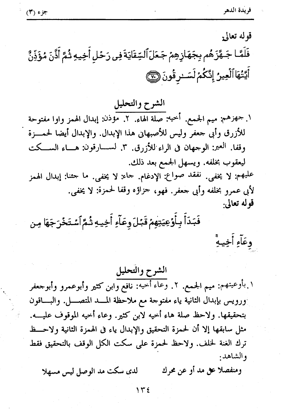 1. جهزهم: ميم الجمع. أخيه: صلة الهاء. 2. مؤذن: إبدال الهمز واوا مفتوحة للأزرق وأبى جعفر وليس للأصبهانى هذا الإبدال. والإبدال أيضا لحمزة وقفا. العير: الوجهان فى الراء للأزرق. 3. لسارقون: هاء السكت ليعقوب بخلفه. ويسهل الجمع بعد ذلك.