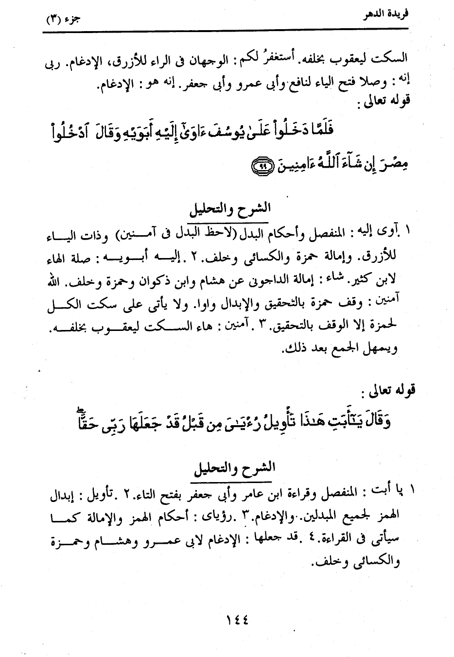 1. يا أبت: المنفصل وقراءة ابن عامر وأبى جعفر بفتح التاء. 2. تأويل: إبدال الهمز لجميع المبدلين. والإدغام. 3. رؤياى: أحكام الهمز والإمالة كما سيأتى فى القراءة. 4. قد جعلها: الإدغام لابى عمرو وهشام وحمزة والكسائى وخلف.
