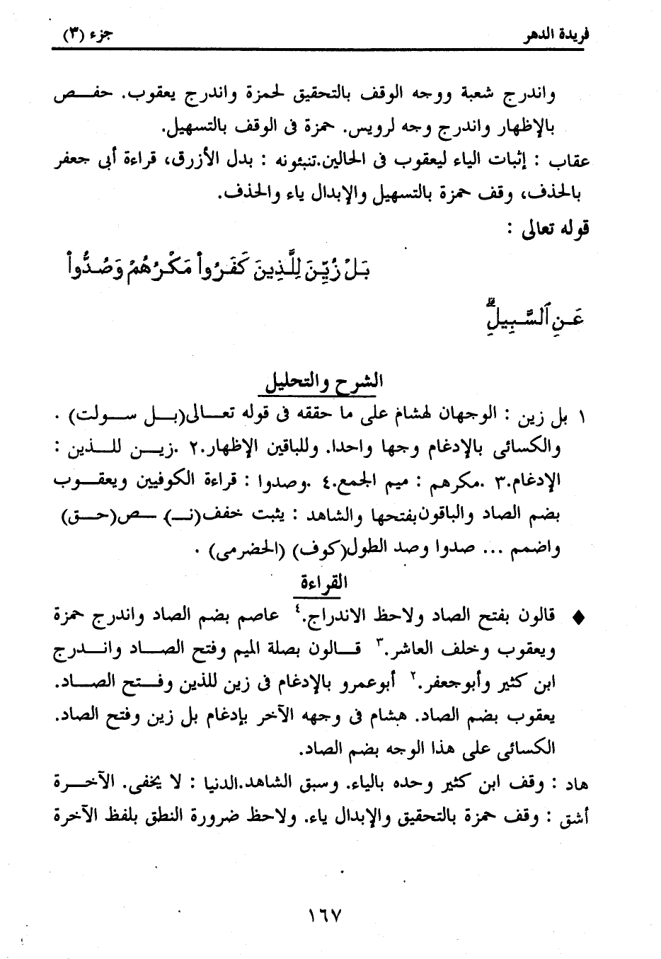 قالون بفتح الصاد ولاحظ الاندراج. (4) عاصم بضم الصاد واندرج حمزة ويعقوب وخلف العاشر. (3) قالون بصلة الميم وفتح الصاد واندرج ابن كثير وأبو جعفر. (2) أبو عمرو بالإدغام فى زين للذين وفتح الصاد.