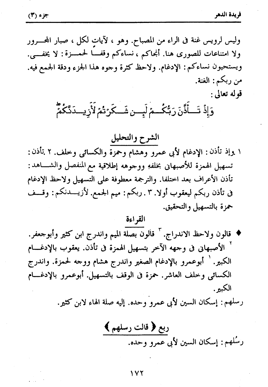 تأذن الأعراف بعد اختلفا. والترجمة معطوفة على التسهيل ولاحظ الإدغام فى تأذن ربكم ليعقوب أولا. 3. ربكم: ميم الجمع. لأزيدنكم: وقف حمزة بالتسهيل والتحقيق.