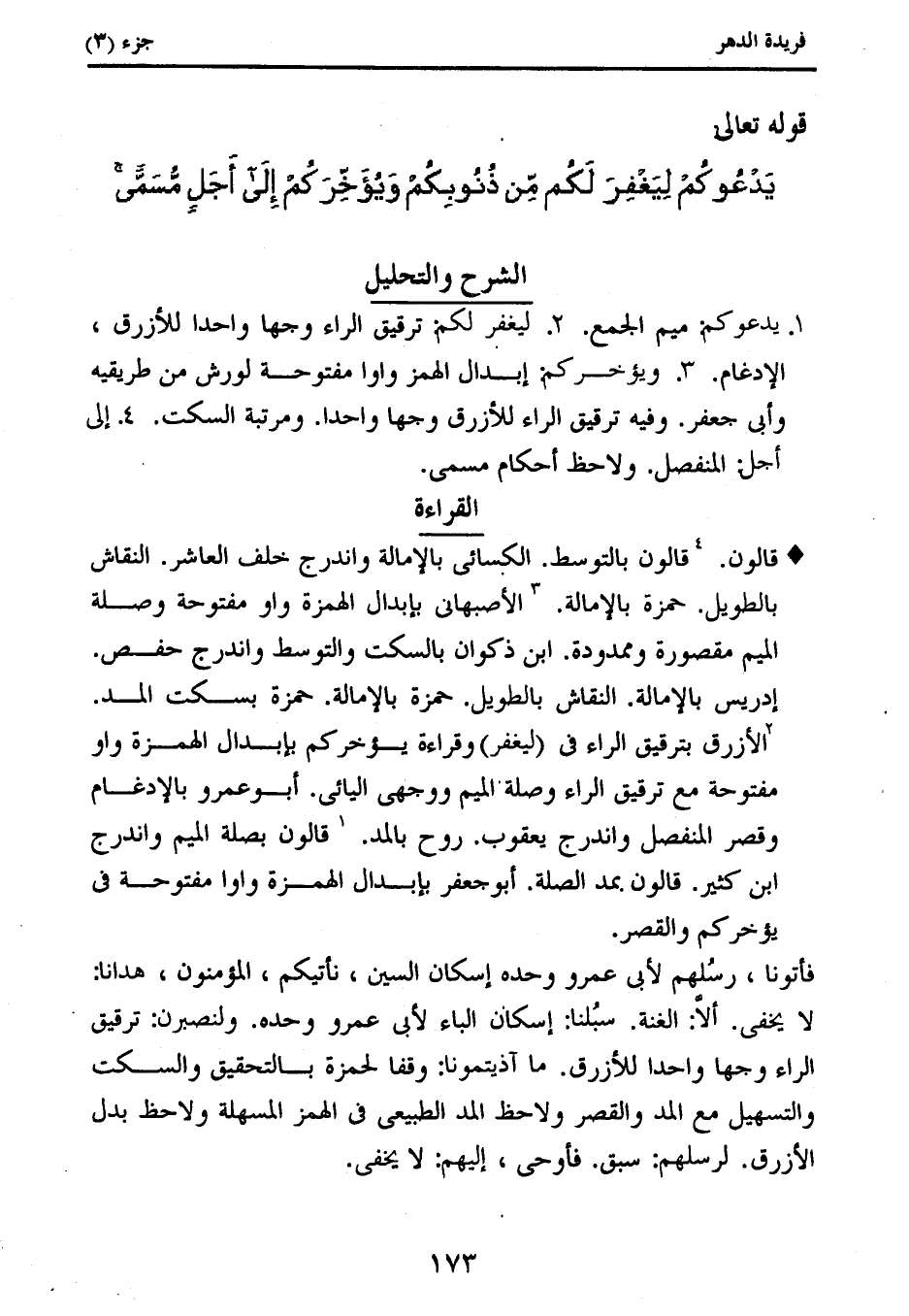 (2) الأزرق بترقيق الراء فى (ليغفر) وقراءة يؤخركم بإبدال الهمزة واو مفتوحة مع ترقيق الراء وصلة الميم ووجهى اليائى. أبو عمرو بالإدغام وقصر المنفصل واندرج يعقوب. روح بالمد. (1) قالون بصلة الميم واندرج ابن كثير. قالون بمد الصلة. أبو جعفر بإبدال الهمزة واوا مفتوحة فى يؤخركم والقصر.