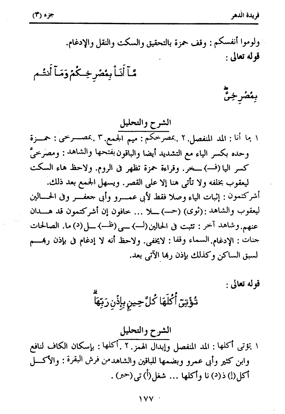1. تؤتى أكلها: المد المنفصل وإبدال الهمز. 2. أكلها: بإسكان الكاف لنافع وابن كثير وأبى عمرو وبضمها للباقين والشاهد من فرش البقرة: والأكل أكل (إ) ذ (د) نا وأكلها ... شغل (أ) تى (حبر).
