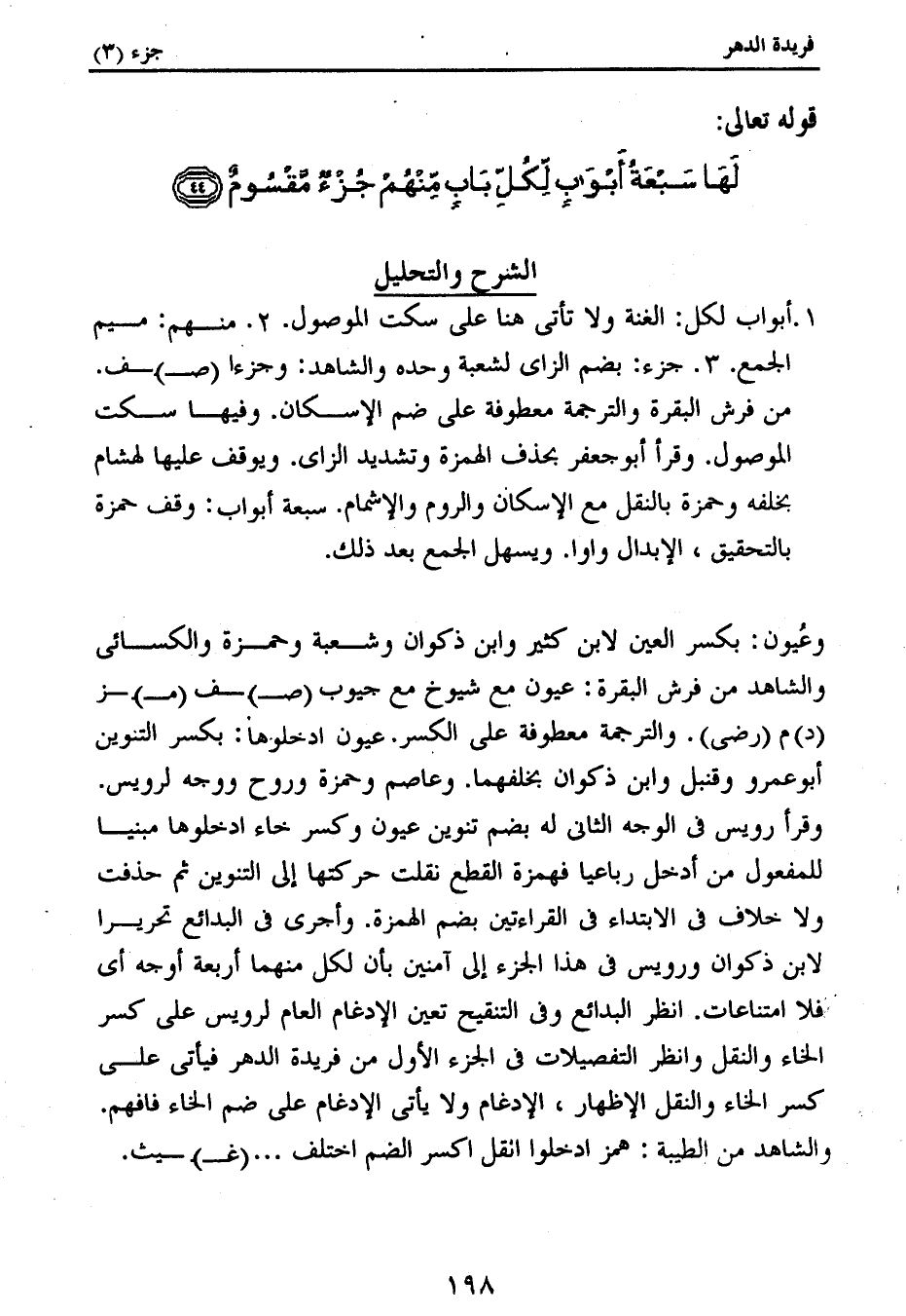 1. أبواب لكل: الغنة ولا تأتى هنا على سكت الموصول. 2. منهم: ميم الجمع. 3. جزء: بضم الزاى لشعبة وحده والشاهد: وجزءا (ص) ف.
