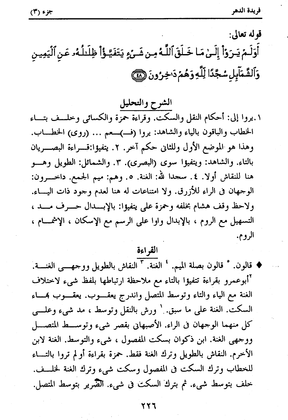 (2) أبو عمرو بقراءة تتفيؤا بالتاء مع ملاحظة ارتباطها بلفظ شىء لاختلاف الغنة مع الياء والتاء وتوسط المتصل واندرج يعقوب. يعقوب بهاء السكت. الغنة على ما سبق. (1) ورش بالنقل وتوسط، مد شىء وعلى كل منهما الوجهان فى الراء. الأصبهانى بقصر شىء وتوسط المتصل ووجهى الغنة. ابن ذكوان بسكت المفصول، شىء والتوسط. الغنة لابن الأخرم. النقاش بالطويل وترك الغنة فقط. حمزة بقراءة أو لم تروا بالتاء للخطاب وترك السكت فى المفصول وسكت شىء وترك الغنة لخلف.