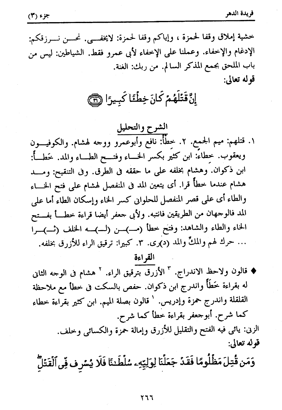 1. قتلهم: ميم الجمع. 2. خطأ: نافع وأبو عمرو ووجه لهشام. والكوفيون ويعقوب. خطاء: ابن كثير بكسر الخاء وفتح الطاء والمد. خطأ: