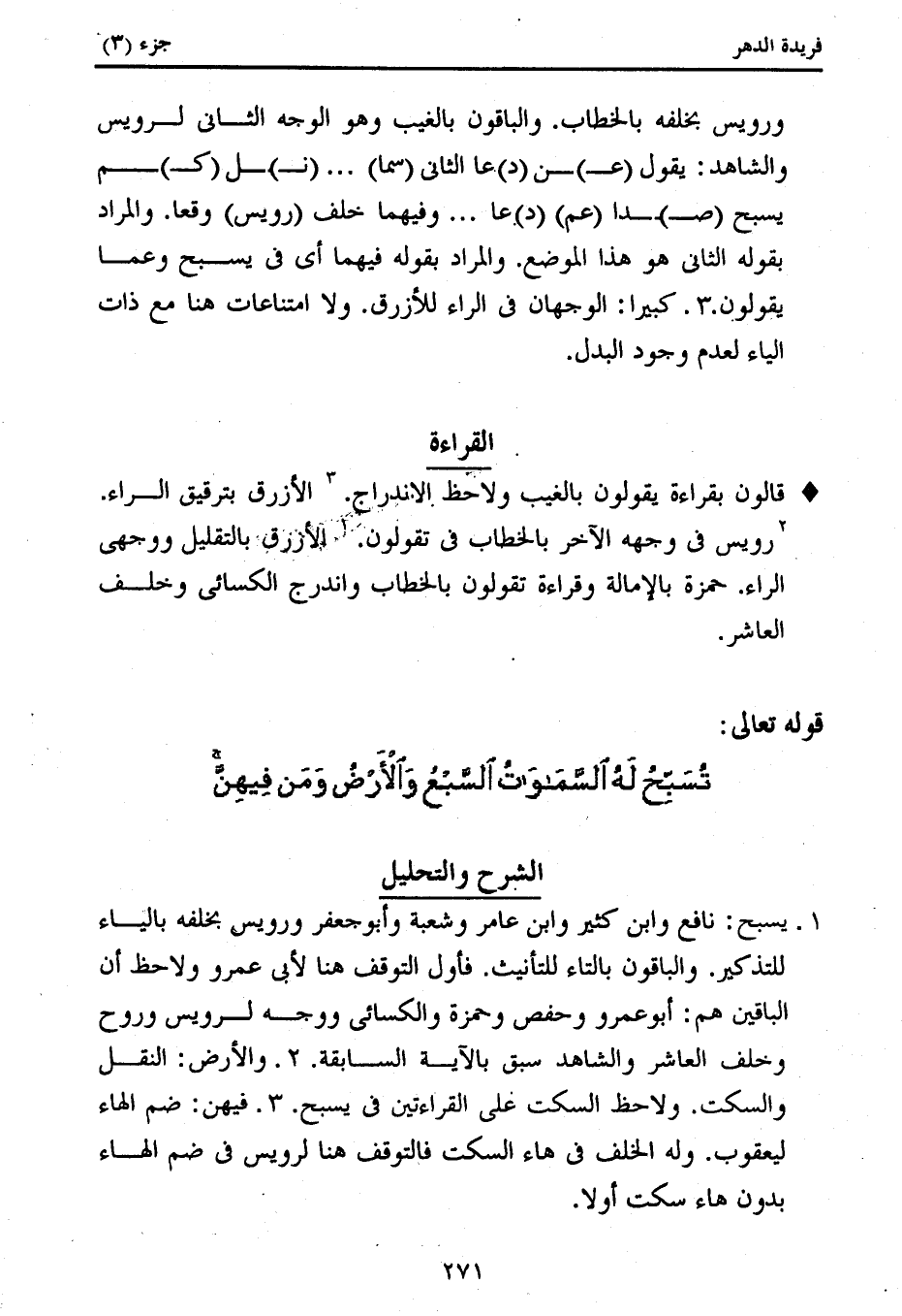 ورويس بخلفه بالخطاب. والباقون بالغيب وهو الوجه الثانى لرويس والشاهد: يقول (ع) ن (د) عا الثانى (سما) ... (ن) ل (ك) م يسبح (ص) دا (عم) (د) عا ... وفيهما خلف (رويس) وقعا. والمراد بقوله الثانى هو هذا الموضع. والمراد بقوله فيهما أى فى يسبح وعما يقولون. 3. كبيرا: الوجهان فى الراء للأزرق. ولا امتناعات هنا مع ذات الياء لعدم وجود البدل.