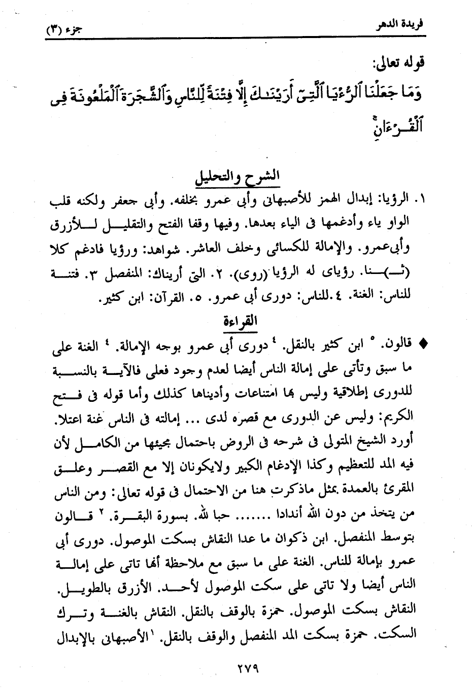 1. الرؤيا: إبدال الهمز للأصبهانى وأبى عمرو بخلفه. وأبى جعفر ولكنه قلب الواو ياء وأدغمها فى الياء بعدها. وفيها وقفا الفتح والتقليل للأزرق وأبى عمرو. والإمالة للكسائى وخلف العاشر. شواهد: ورؤيا فادغم كلا (ث) نا. رؤياى له الرؤيا (روى). 2. التى أريناك: المنفصل 3. فتنة للناس: الغنة. 4. للناس: دورى أبى عمرو. 5. القرآن: ابن كثير.