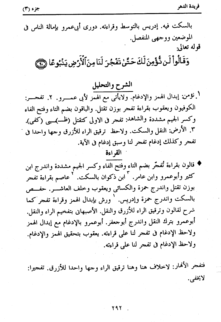 الكوفيون ويعقوب بقراءة تفجر بوزن تقتل. والباقون بضم التاء وفتح الفاء وكسر الجيم مشددة والشاهد: تفجر فى الاولى كتقتل (ظ) بى (كفى).