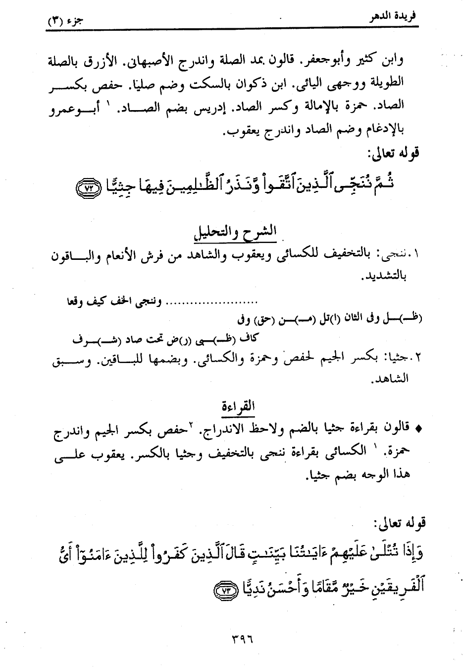 قالون بقراءة جثيا بالضم ولاحظ الاندراج. (2) حفص بكسر الجيم واندرج حمزة. (1) الكسائى بقراءة ننجى بالتخفيف وجثيا بالكسر. يعقوب على هذا الوجه بضم جثيا.