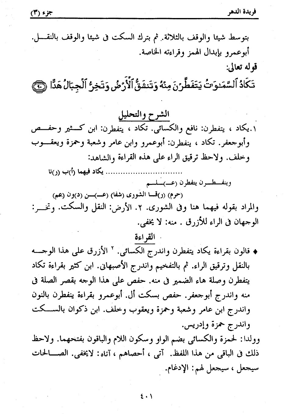 1. يكاد، يتفطرن: نافع والكسائى. تكاد، يتفطرن: ابن كثير وحفص وأبو جعفر. تكاد، ينفطرن: أبو عمرو وابن عامر وشعبة وحمزة ويعقوب وخلف. ولاحظ ترقيق الراء على هذه القراءة والشاهد: