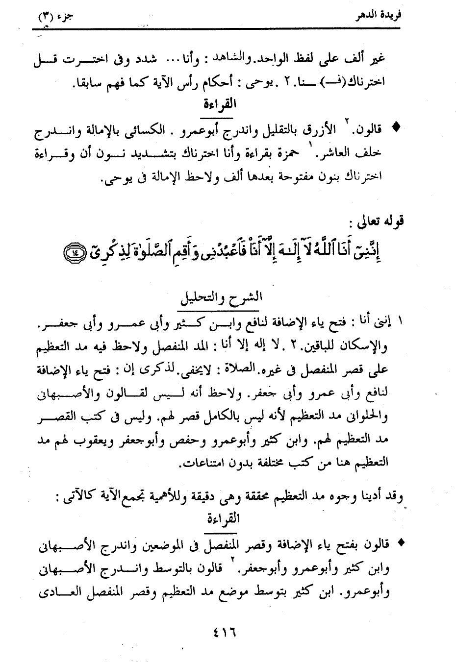 والإسكان للباقين. 2. لا إله إلا أنا: المد المنفصل ولاحظ فيه مد التعظيم على قصر المنفصل فى غيره. الصلاة: لا يخفى. لذكرى إن: فتح ياء الإضافة لنافع وأبى عمرو وأبى جعفر. ولاحظ أنه ليس لقالون والأصبهانى والحلوانى مد التعظيم لأنه ليس بالكامل قصر لهم. وليس فى كتب القصر مد التعظيم لهم. وابن كثير وأبو عمرو وحفص وأبو جعفر ويعقوب لهم مد التعظيم هنا من كتب مختلفة بدون امتناعات.