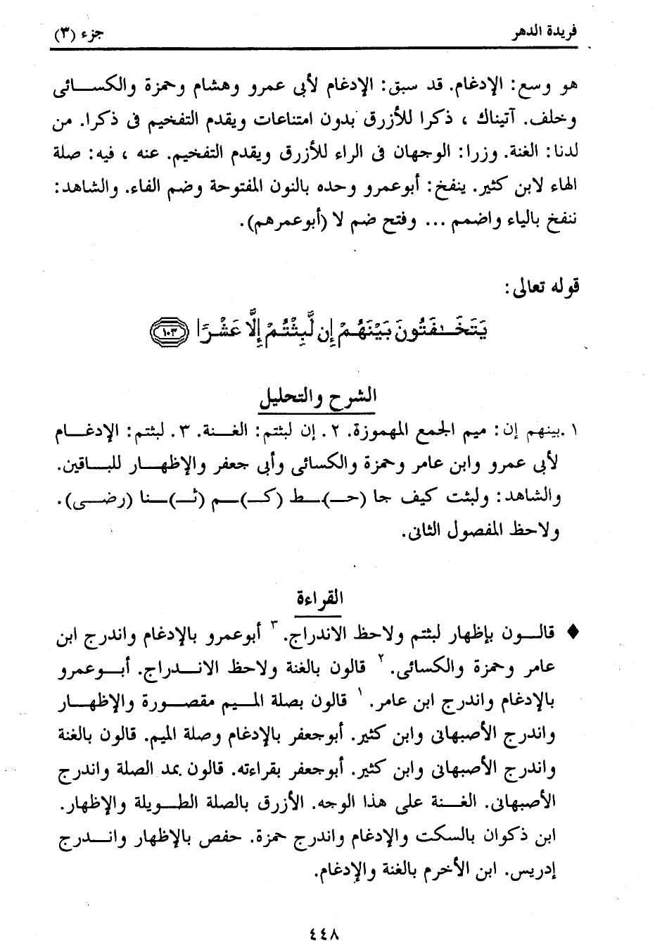 قالون بإظهار لبثتم ولاحظ الاندراج. (3) أبو عمرو بالإدغام واندرج ابن عامر وحمزة والكسائى. (2) قالون بالغنة ولاحظ الاندراج. أبو عمرو بالإدغام واندرج ابن عامر. (1) قالون بصلة الميم مقصورة والإظهار واندرج الأصبهانى وابن كثير. أبو جعفر بالإدغام وصلة الميم. قالون بالغنة واندرج الأصبهانى وابن كثير. أبو جعفر بقراءته. قالون بمد الصلة واندرج الأصبهانى. الغنة على هذا الوجه. الأزرق بالصلة الطويلة والإظهار.