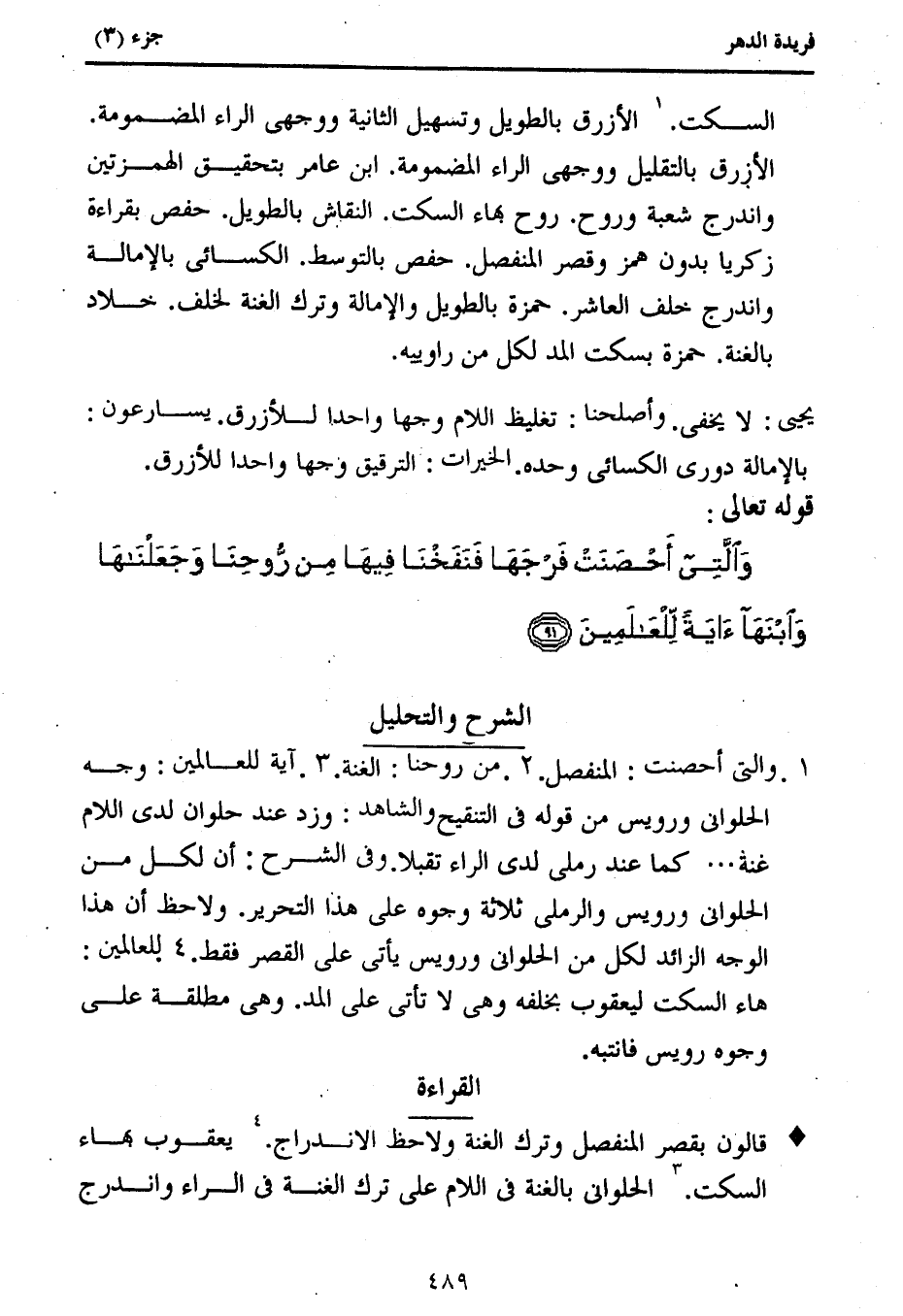 1. والتى أحصنت: المنفصل. 2. من روحنا: الغنة. 3. آية للعالمين: وجه الحلوانى ورويس من قوله فى التنقيح والشاهد: وزد عند حلوان لدى اللام غنة ... كما عند رملى لدى الراء تقبلا. وفى الشرح: أن لكل من الحلوانى ورويس والرملى ثلاثة وجوه على هذا التحرير. ولاحظ أن هذا الوجه الزائد لكل من الحلوانى ورويس يأتى على القصر فقط. 4. للعالمين: