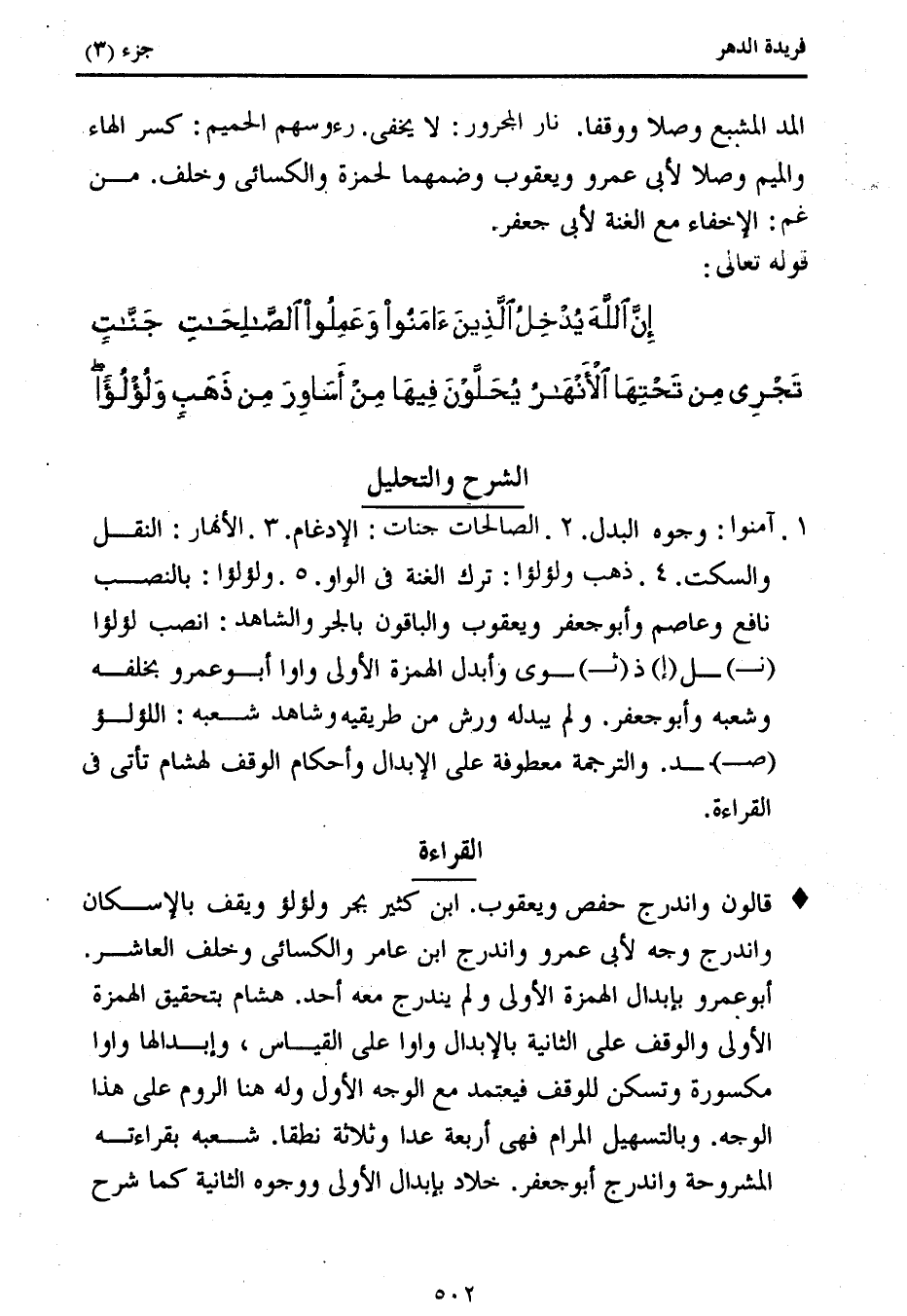 1. آمنوا: وجوه البدل. 2. الصالحات جنات: الإدغام. 3. الأنهار: النقل والسكت. 4. ذهب ولؤلؤا: ترك الغنة فى الواو. 5. ولؤلؤا: بالنصب نافع وعاصم وأبو جعفر ويعقوب والباقون بالجر والشاهد: انصب لؤلؤا (ن) ل (إ) ذ (ث) وى وأبدل الهمزة الأولى واوا أبو عمرو بخلفه وشعبة وأبو جعفر. ولم يبدله ورش من طريقيه وشاهد شعبة: اللؤلؤ (ص) د. والترجمة معطوفة على الإبدال وأحكام الوقف لهشام تأتى فى القراءة.